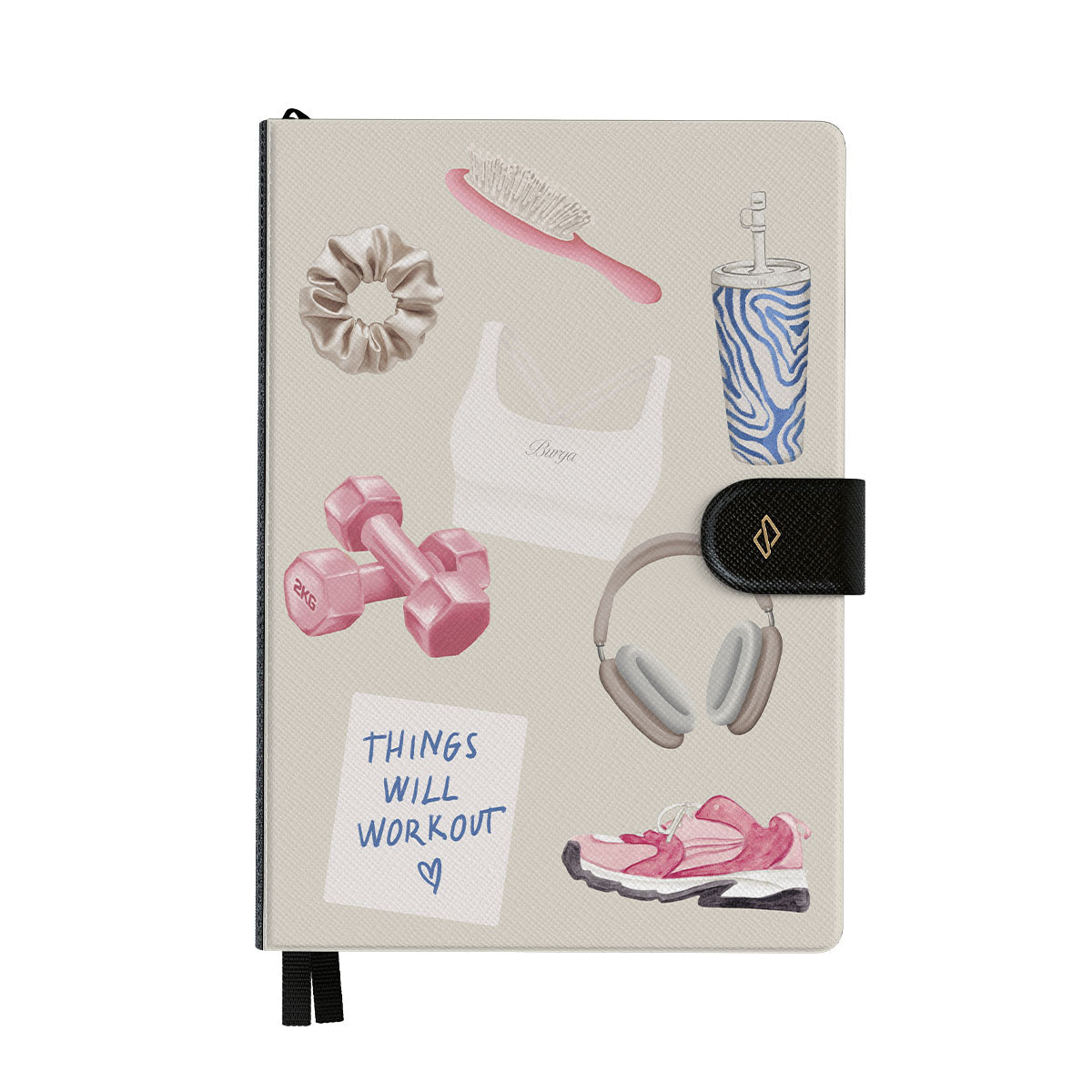 Dizaino ypatybės: svarmenys, ausinės, puodelis, plaukų šepetys, rožiniai sportbačiai, sportinė liemenėlė, plaukų gumelė, lipnus lapelis su užrašu „Things Will Work Out“