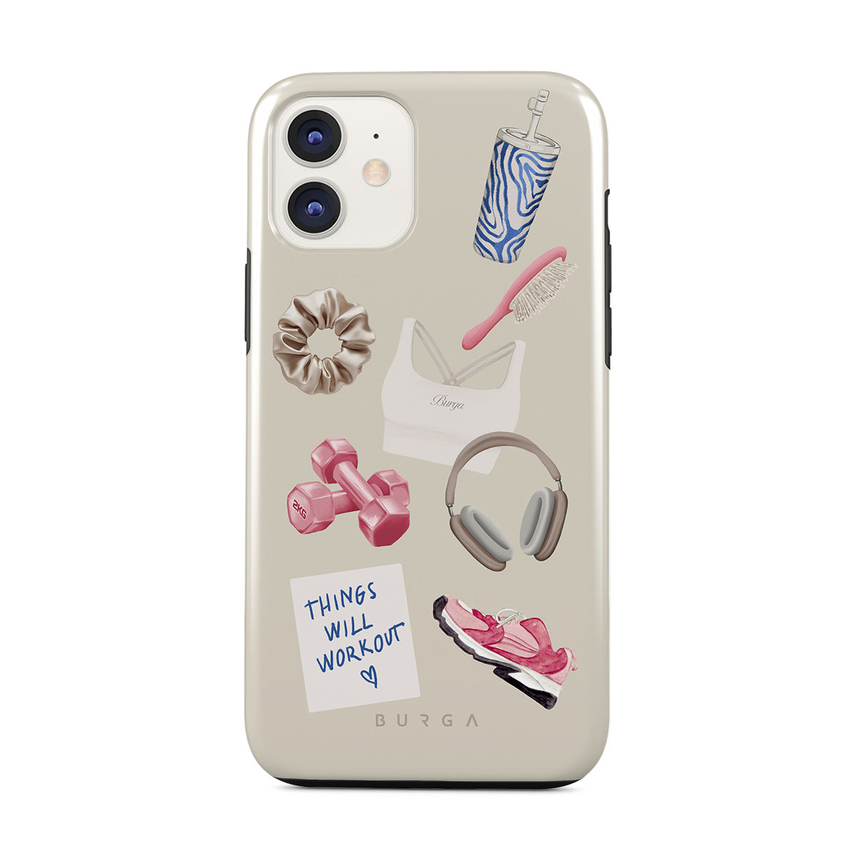 Dizaino ypatybės: svarmenys, ausinės, puodelis, plaukų šepetys, rožiniai sportbačiai, sportinė liemenėlė, plaukų gumelė, lipnus lapelis su užrašu „Things Will Work Out“