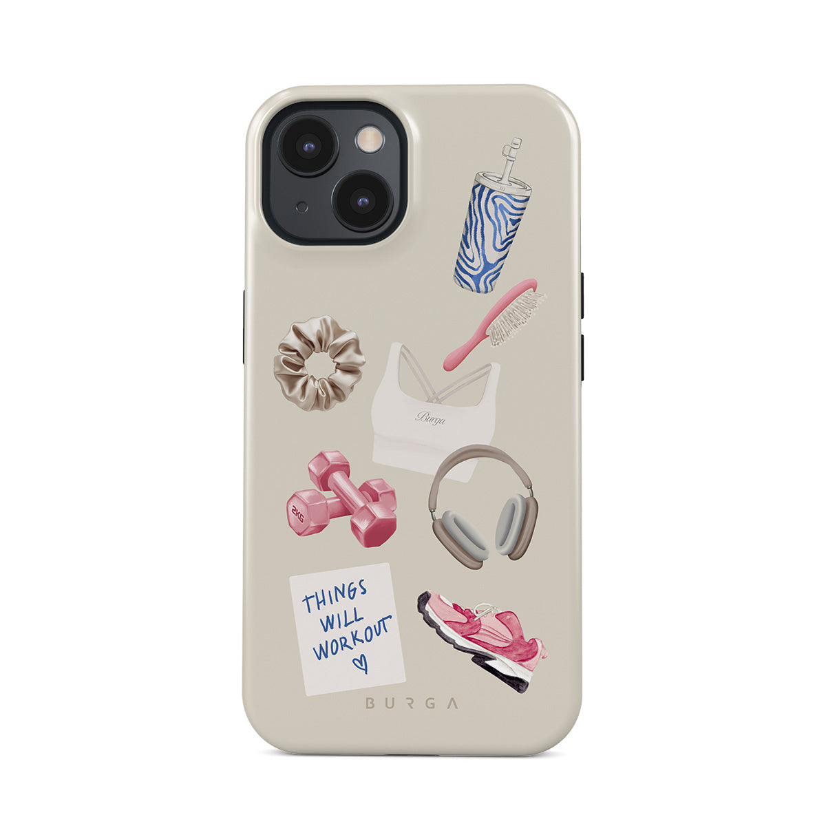 Dizaino ypatybės: svarmenys, ausinės, puodelis, plaukų šepetys, rožiniai sportbačiai, sportinė liemenėlė, plaukų gumelė, lipnus lapelis su užrašu „Things Will Work Out“
