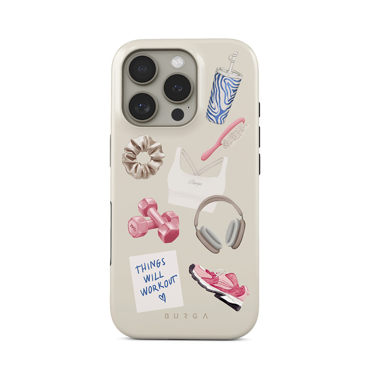 Dizaino ypatybės: svarmenys, ausinės, puodelis, plaukų šepetys, rožiniai sportbačiai, sportinė liemenėlė, plaukų gumelė, lipnus lapelis su užrašu „Things Will Work Out“