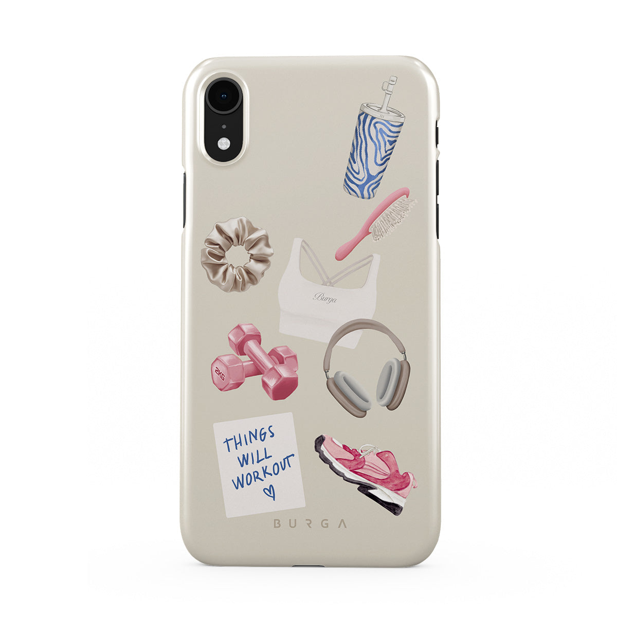 Dizaino ypatybės: svarmenys, ausinės, puodelis, plaukų šepetys, rožiniai sportbačiai, sportinė liemenėlė, plaukų gumelė, lipnus lapelis su užrašu „Things Will Work Out“