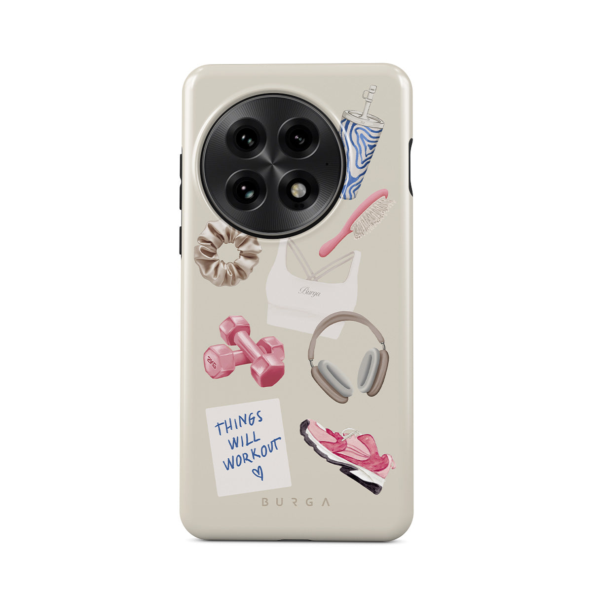 Dizaino ypatybės: svarmenys, ausinės, puodelis, plaukų šepetys, rožiniai sportbačiai, sportinė liemenėlė, plaukų gumelė, lipnus lapelis su užrašu „Things Will Work Out“