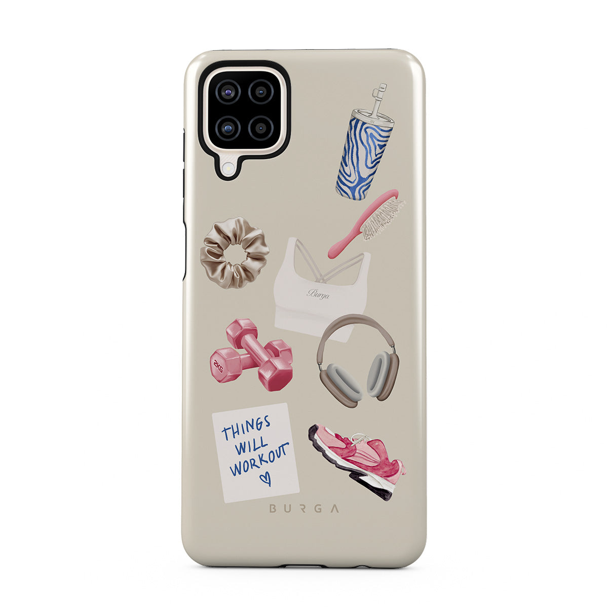 Dizaino ypatybės: svarmenys, ausinės, puodelis, plaukų šepetys, rožiniai sportbačiai, sportinė liemenėlė, plaukų gumelė, lipnus lapelis su užrašu „Things Will Work Out“