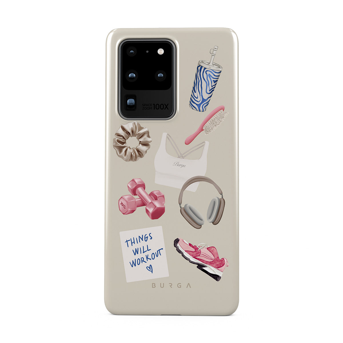 Dizaino ypatybės: svarmenys, ausinės, puodelis, plaukų šepetys, rožiniai sportbačiai, sportinė liemenėlė, plaukų gumelė, lipnus lapelis su užrašu „Things Will Work Out“