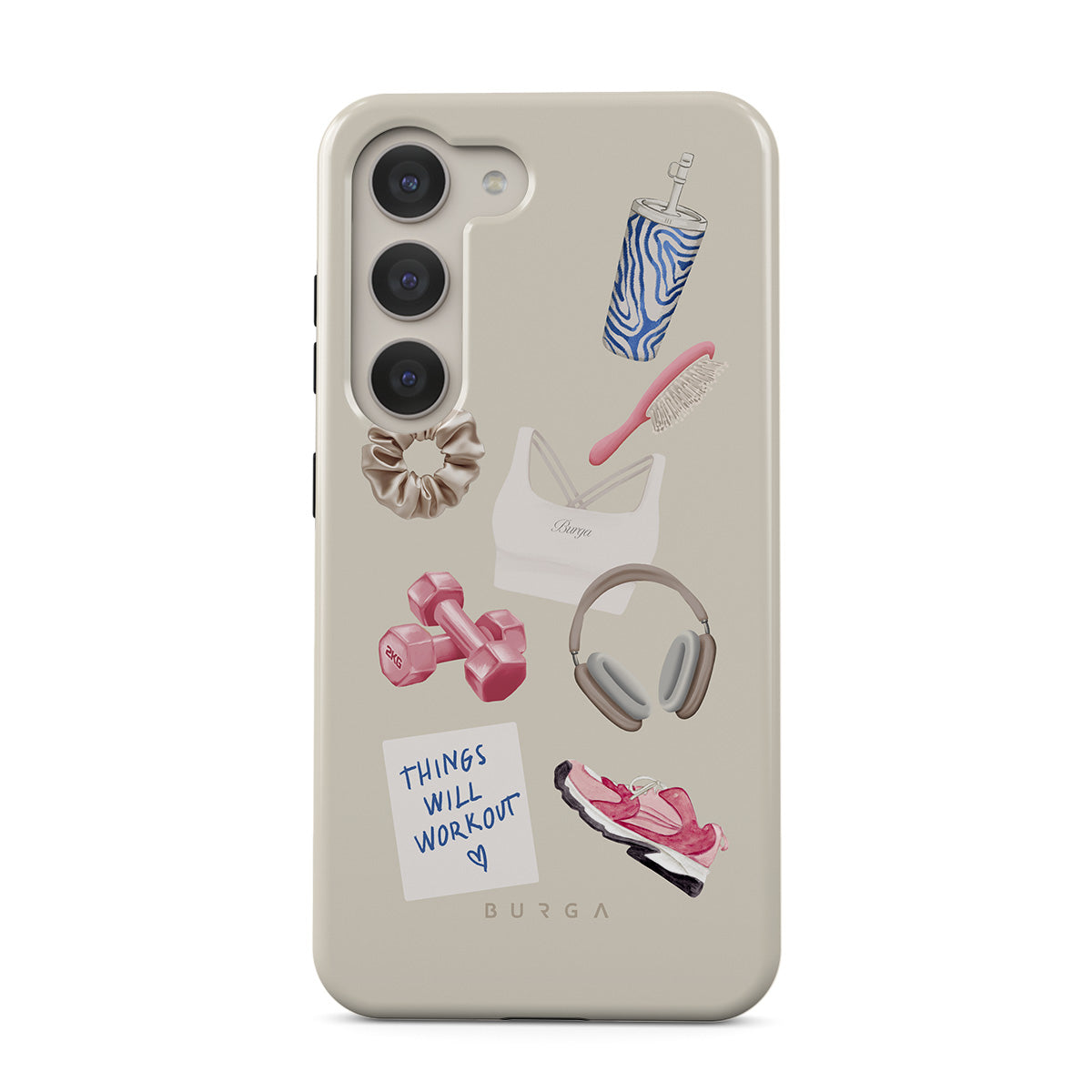 Dizaino ypatybės: svarmenys, ausinės, puodelis, plaukų šepetys, rožiniai sportbačiai, sportinė liemenėlė, plaukų gumelė, lipnus lapelis su užrašu „Things Will Work Out“
