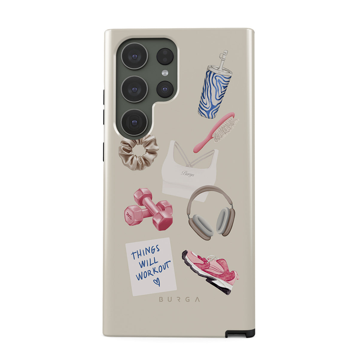 Dizaino ypatybės: svarmenys, ausinės, puodelis, plaukų šepetys, rožiniai sportbačiai, sportinė liemenėlė, plaukų gumelė, lipnus lapelis su užrašu „Things Will Work Out“