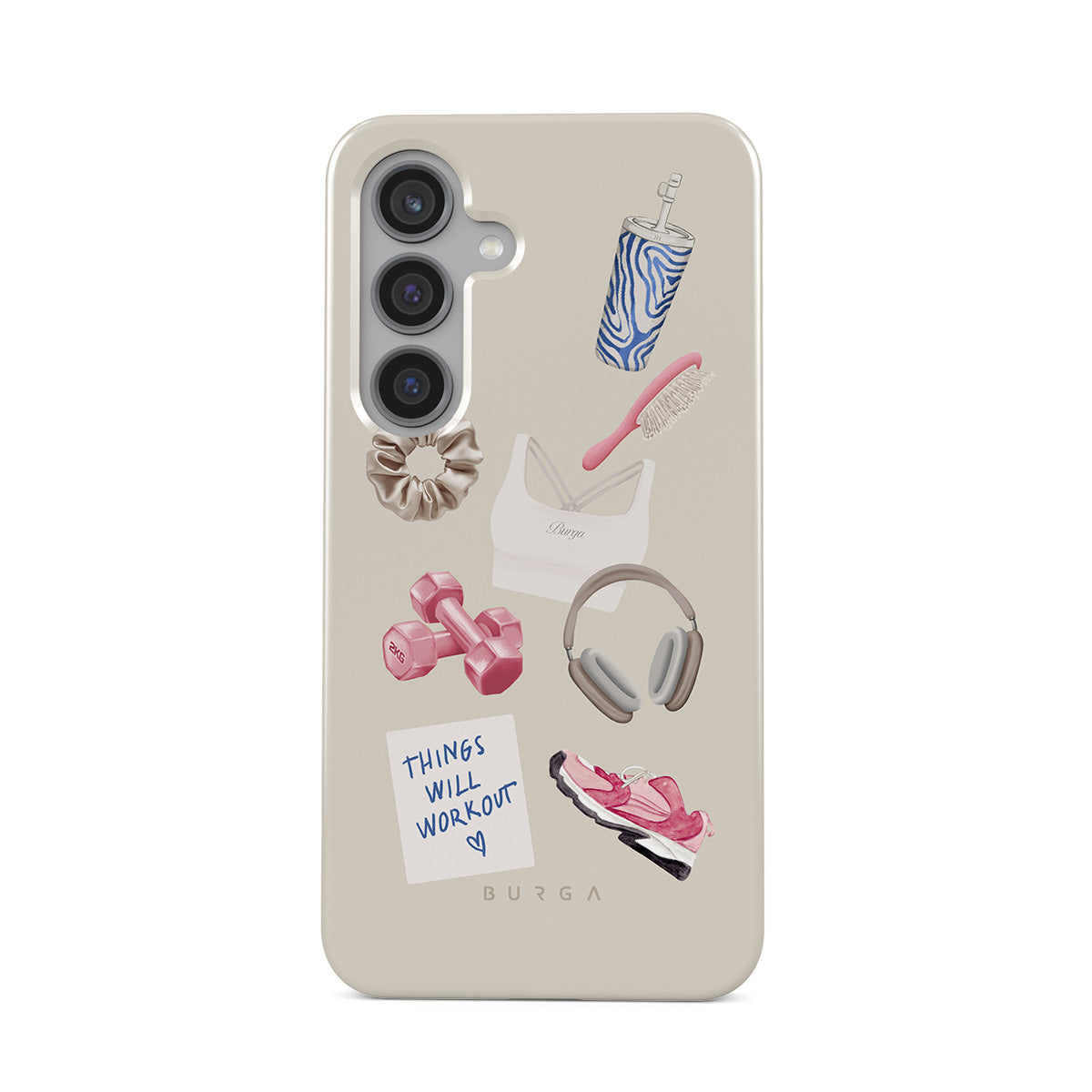 Dizaino ypatybės: svarmenys, ausinės, puodelis, plaukų šepetys, rožiniai sportbačiai, sportinė liemenėlė, plaukų gumelė, lipnus lapelis su užrašu „Things Will Work Out“