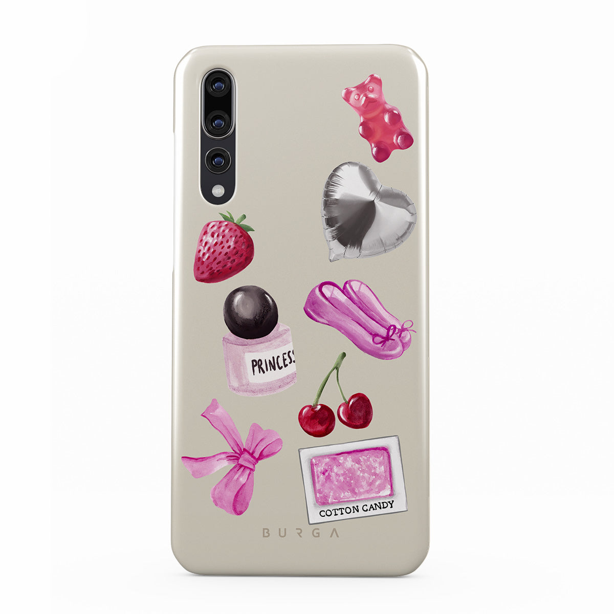 Dizaino ypatybės: rožinis kaspinas, sidabrinis širdelės formos balionas, kvepalų buteliukas, braškė, vyšnia, rožinės baleto šlepetės, cukraus vatos lipdukas, rožinis guminis meškiukas