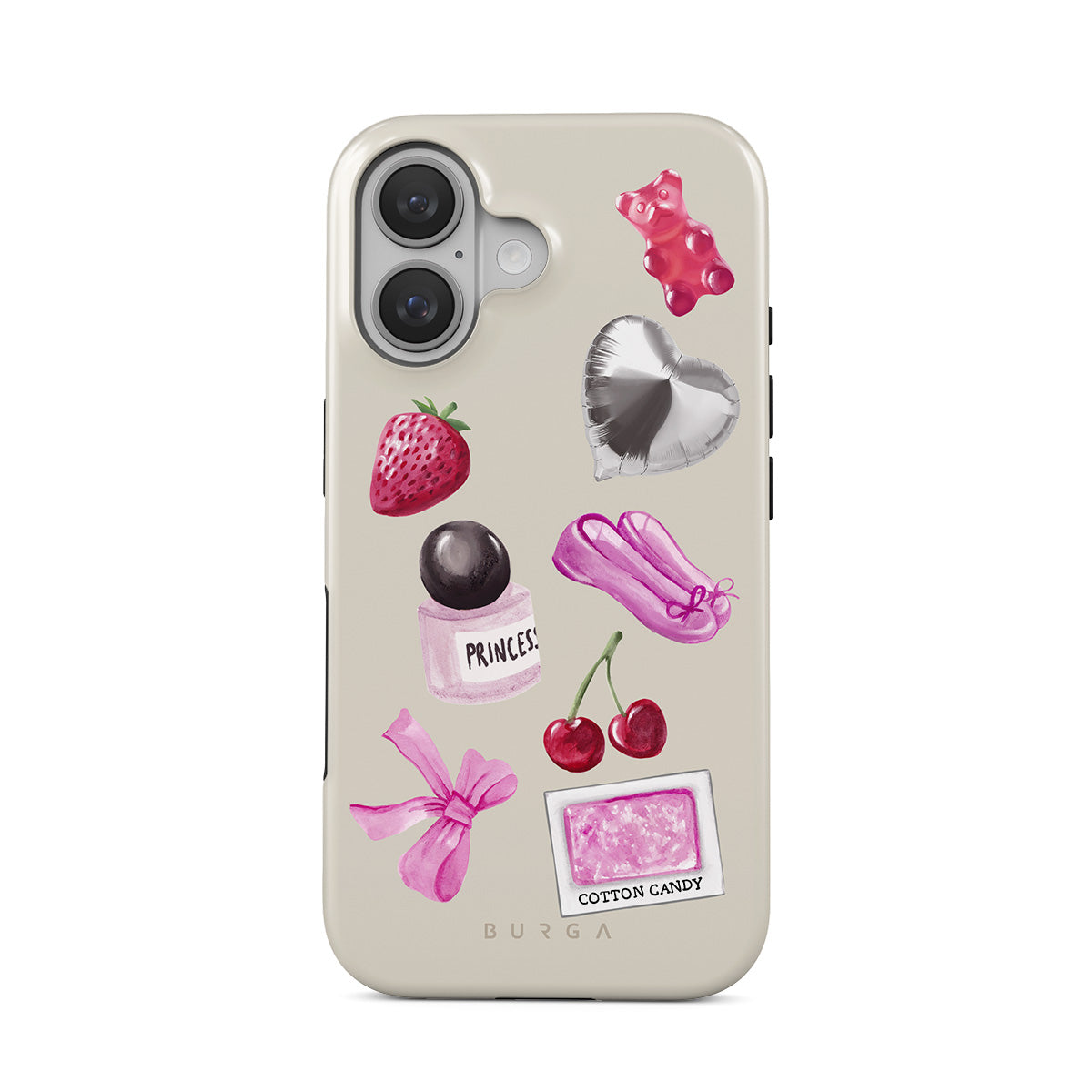 Dizaino ypatybės: rožinis kaspinas, sidabrinis širdelės formos balionas, kvepalų buteliukas, braškė, vyšnia, rožinės baleto šlepetės, cukraus vatos lipdukas, rožinis guminis meškiukas