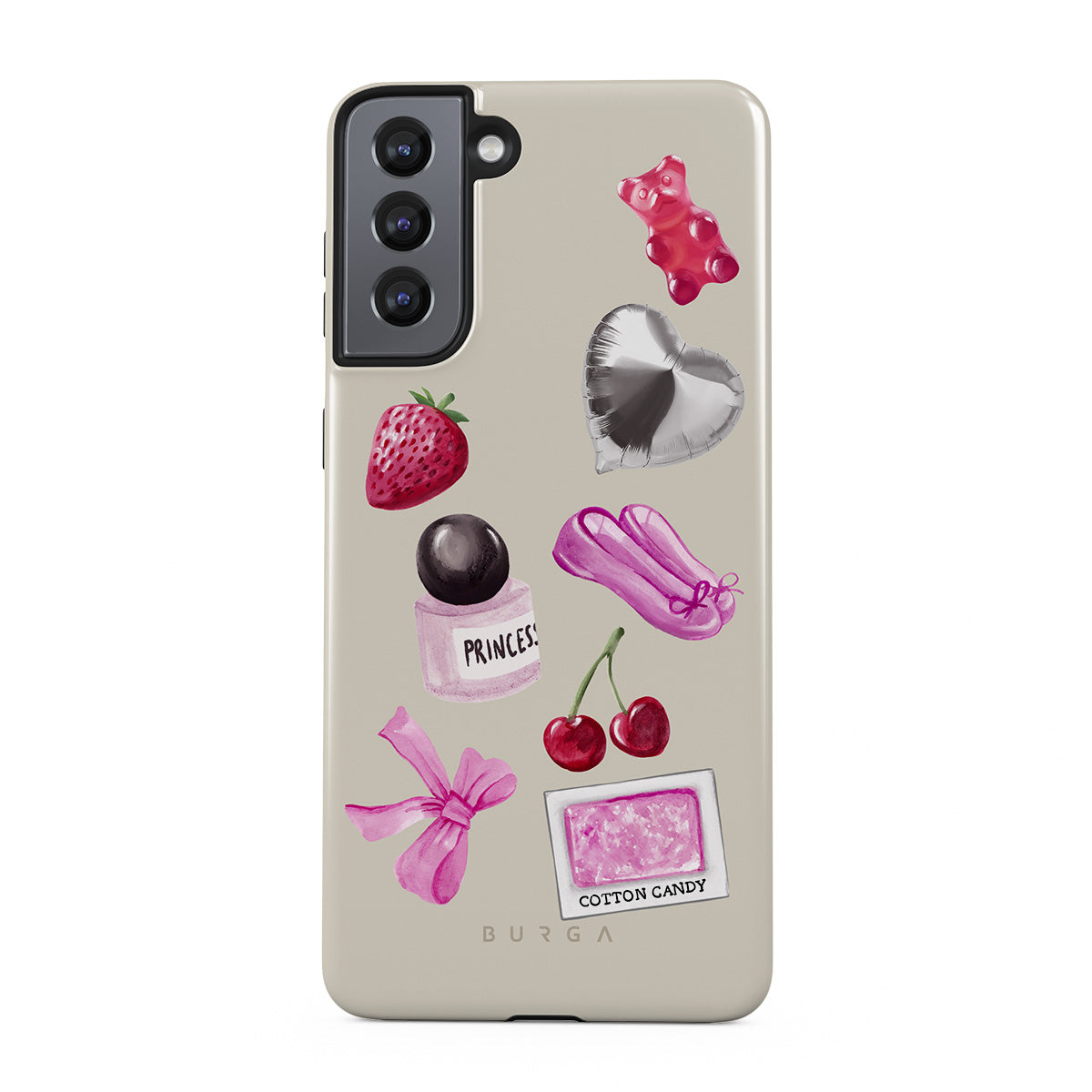 Dizaino ypatybės: rožinis kaspinas, sidabrinis širdelės formos balionas, kvepalų buteliukas, braškė, vyšnia, rožinės baleto šlepetės, cukraus vatos lipdukas, rožinis guminis meškiukas