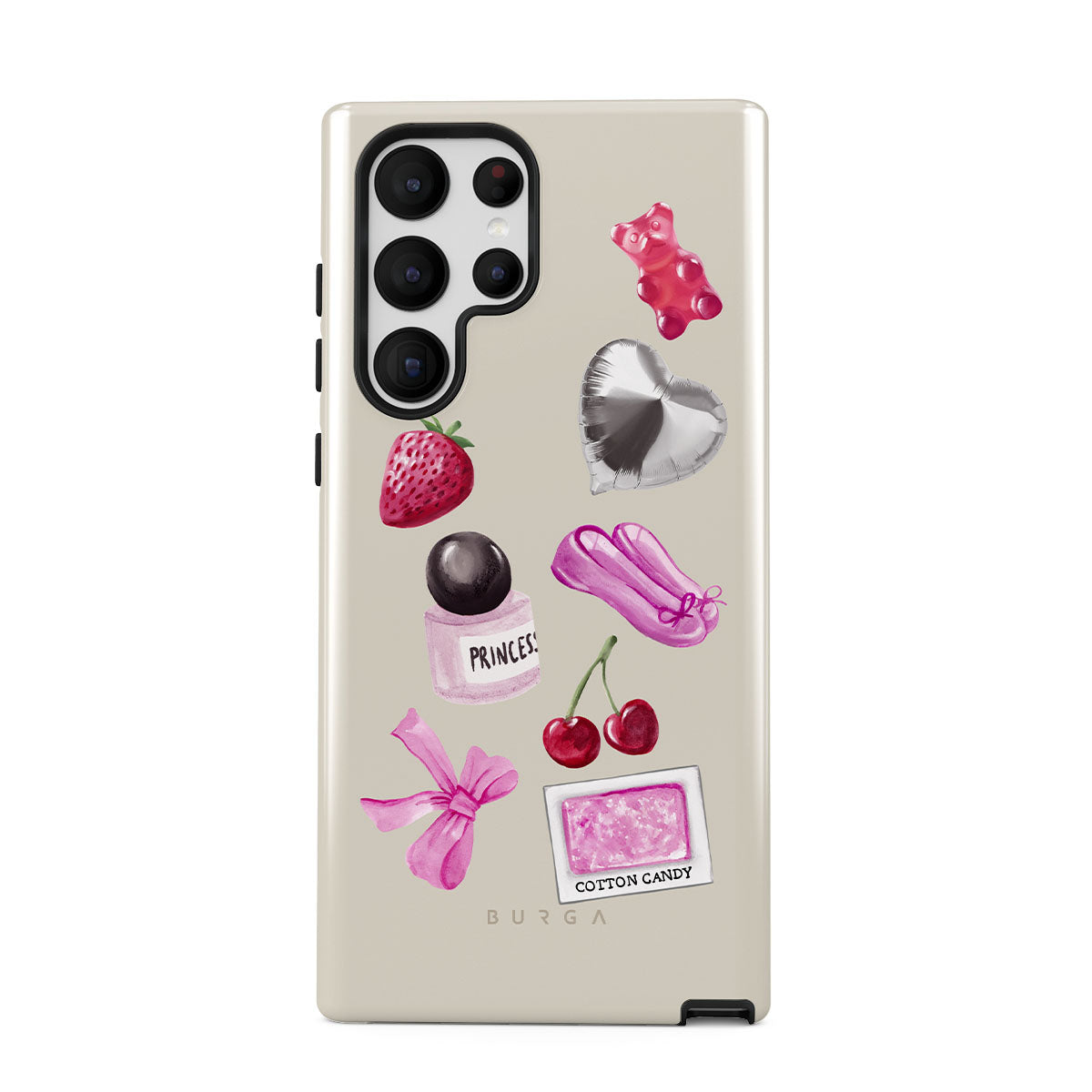Dizaino ypatybės: rožinis kaspinas, sidabrinis širdelės formos balionas, kvepalų buteliukas, braškė, vyšnia, rožinės baleto šlepetės, cukraus vatos lipdukas, rožinis guminis meškiukas