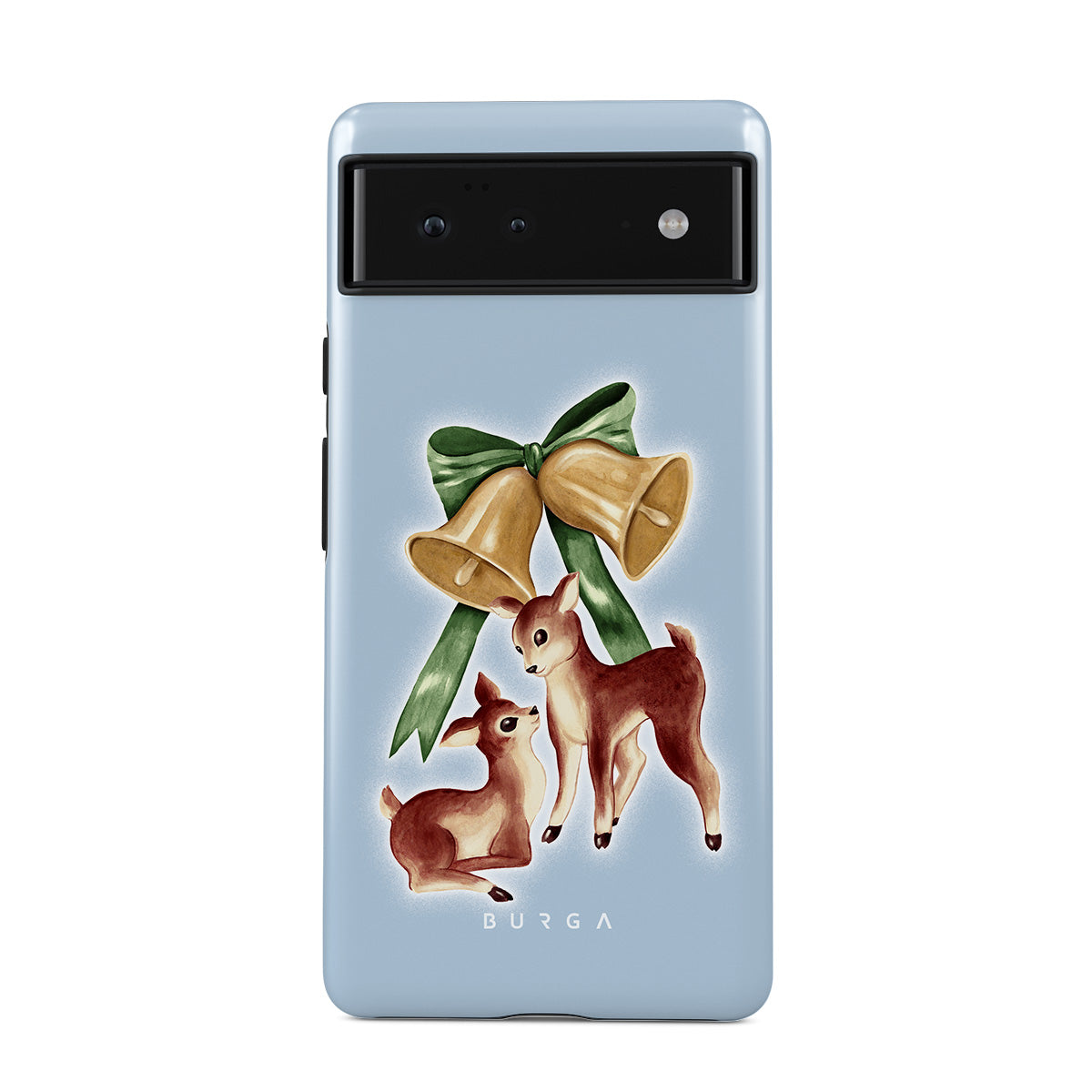 Dizaino ypatybės: vintažinis elnias, Kalėdų varpai, auksiniai varpai, retro stiliaus elnio iliustracija, mažas elniukas, šviesiai mėlynas fonas