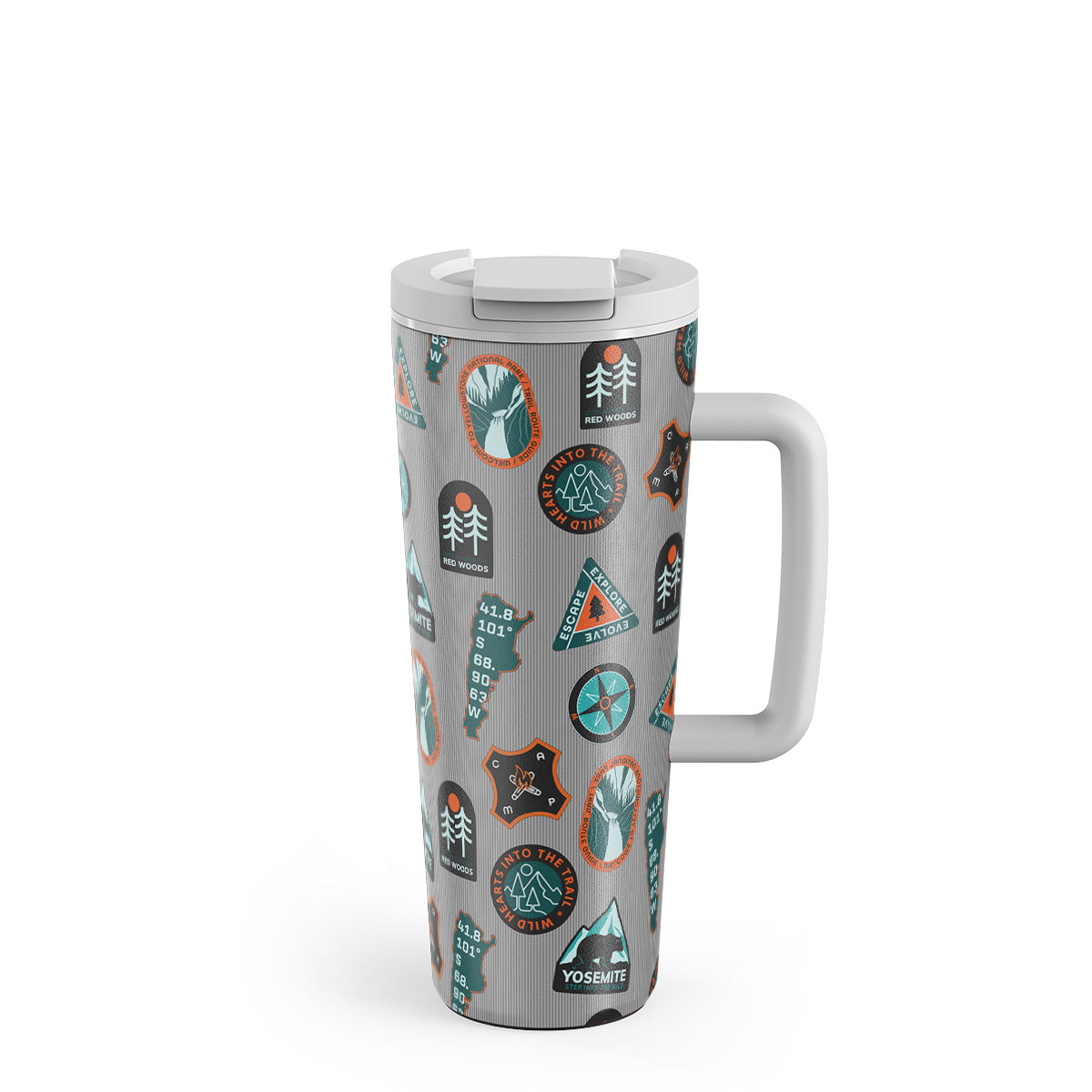 Dizaino ypatybės: gamtos tematikos emblemos, gamta, kalnai, nuotykiai, vintažas, ženkliukai