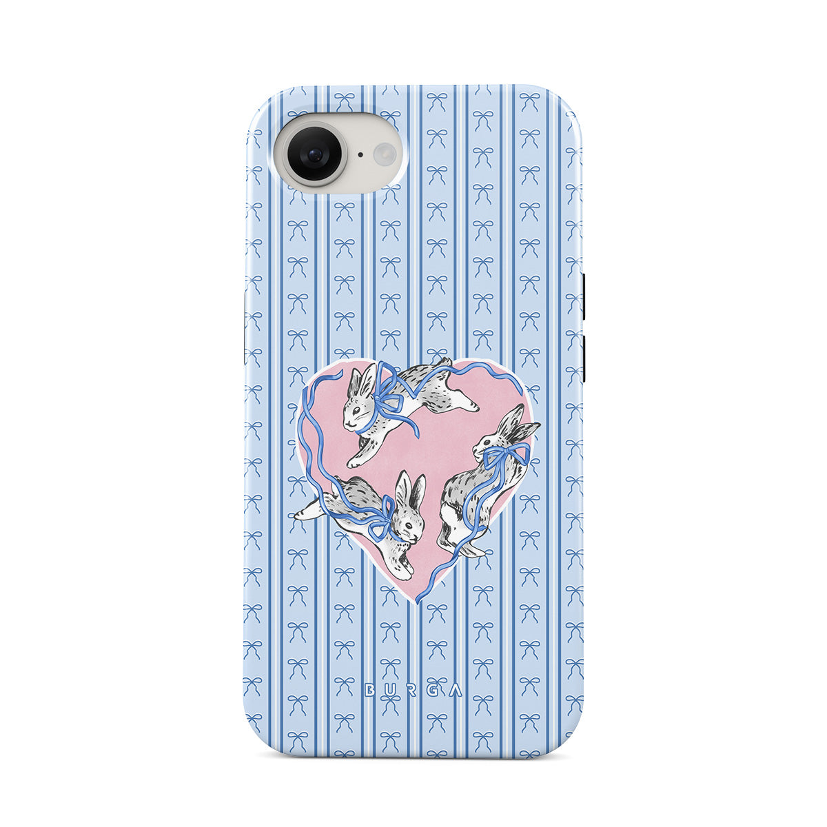 Dizaino ypatybės: balti triušiai, širdelės rėmelis, mėlynos juostelės