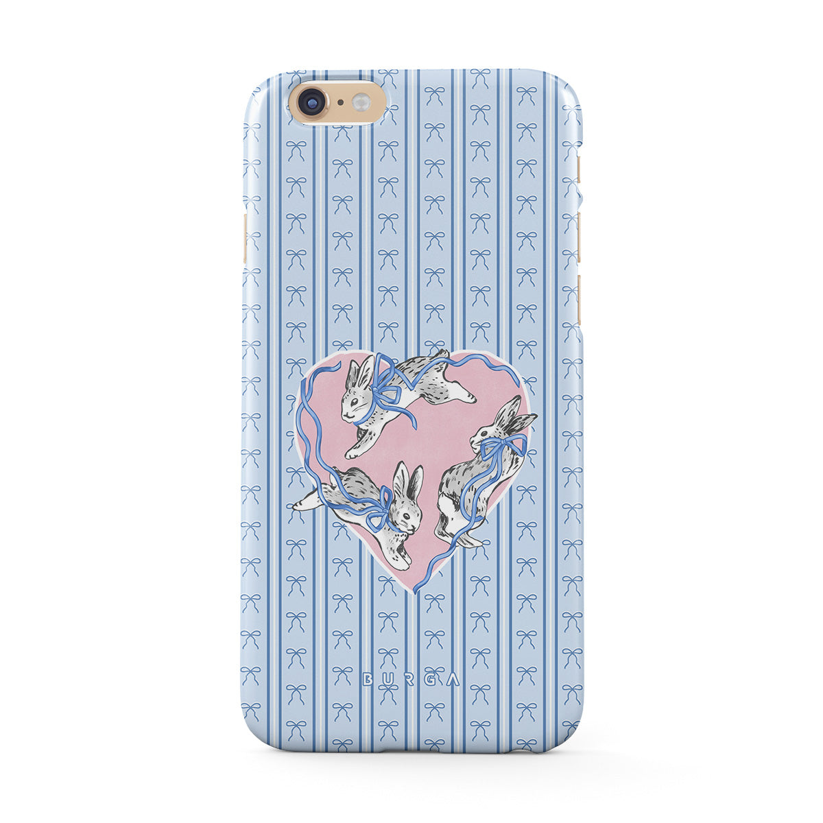 Dizaino ypatybės: balti triušiai, širdelės rėmelis, mėlynos juostelės