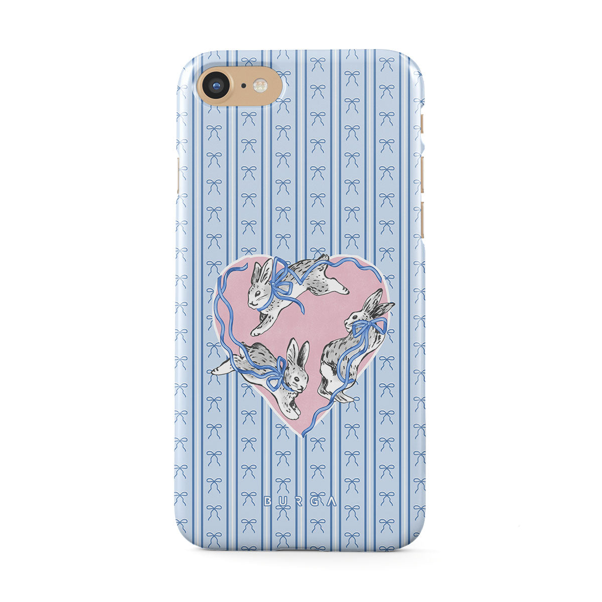 Dizaino ypatybės: balti triušiai, širdelės rėmelis, mėlynos juostelės