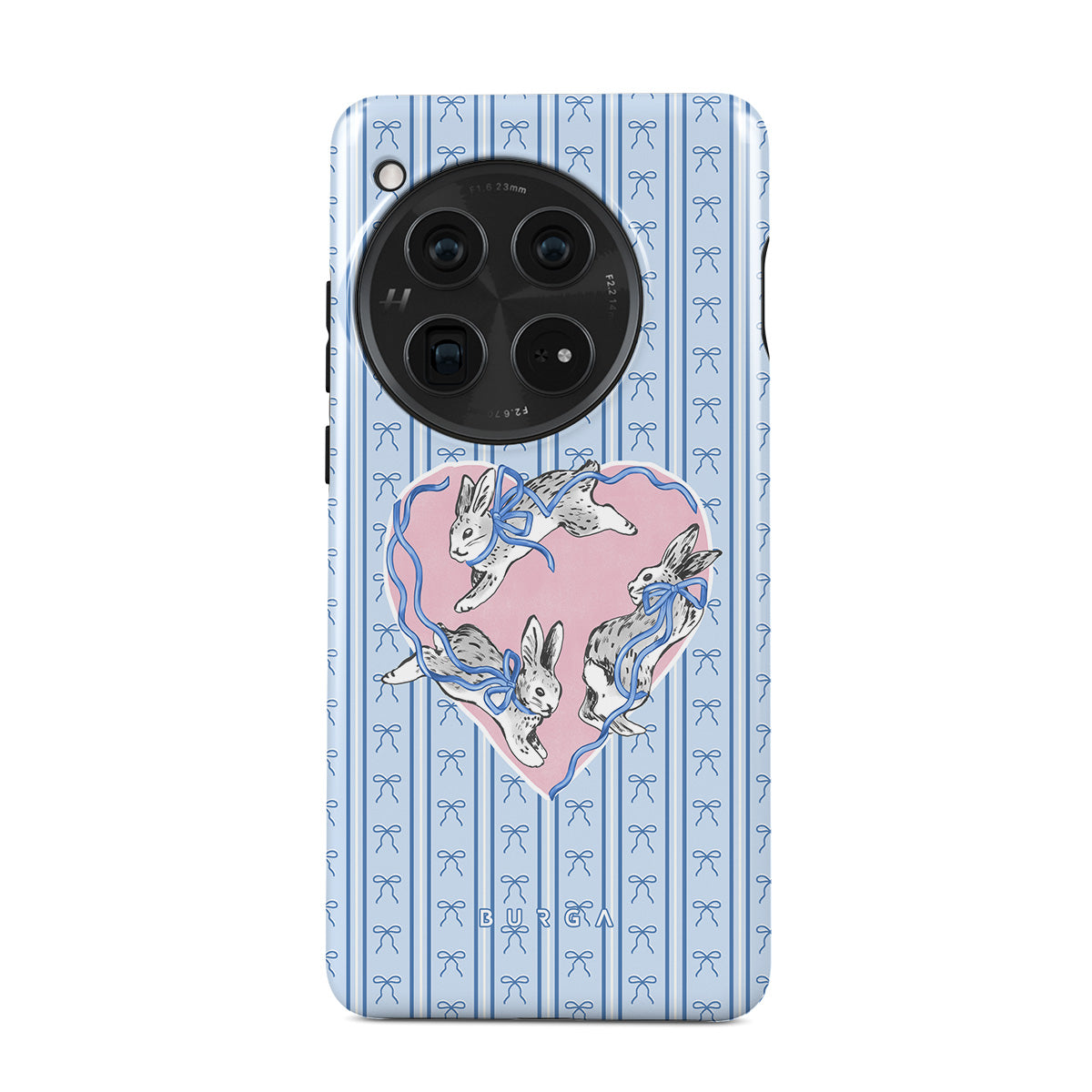 Dizaino ypatybės: balti triušiai, širdelės rėmelis, mėlynos juostelės