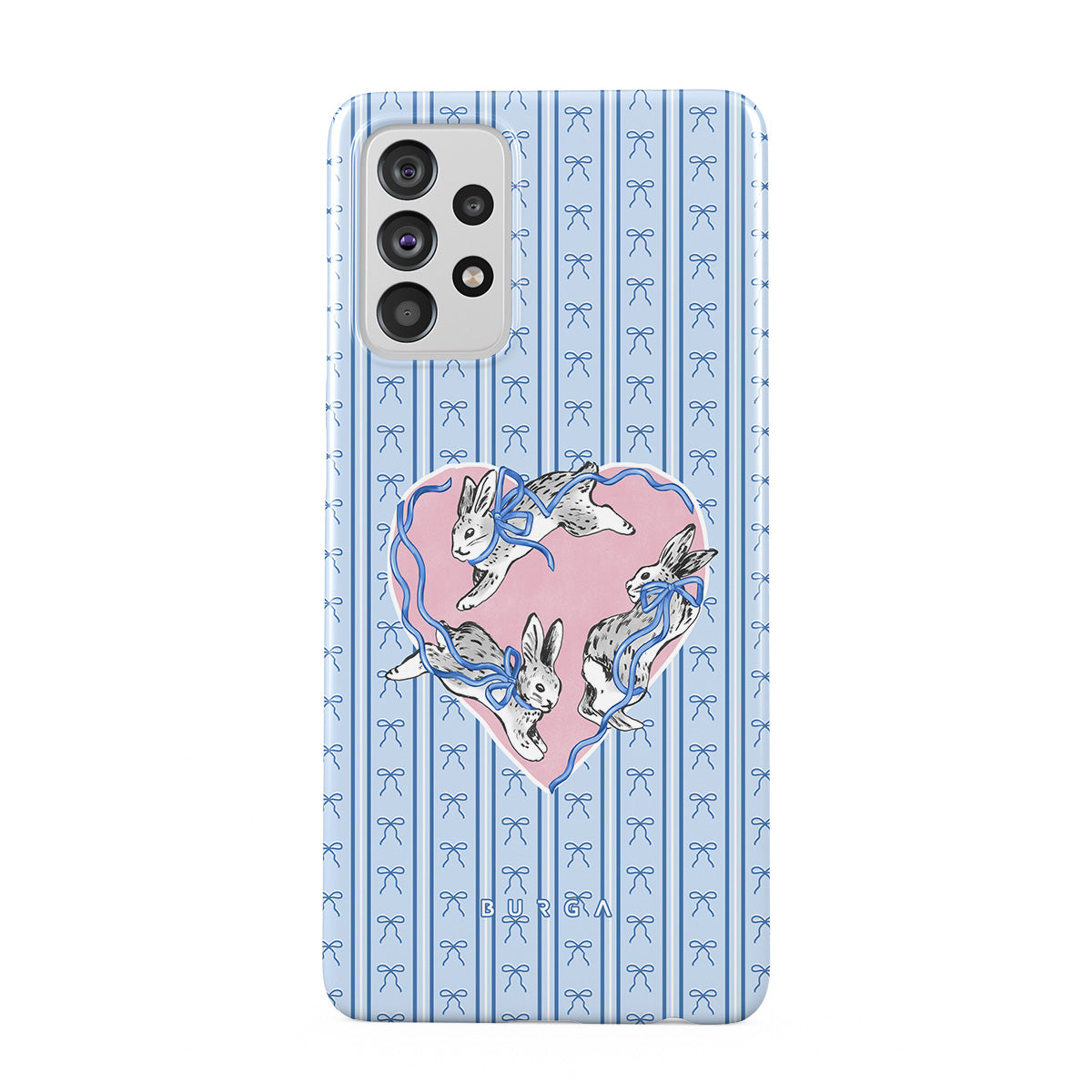 Dizaino ypatybės: balti triušiai, širdelės rėmelis, mėlynos juostelės