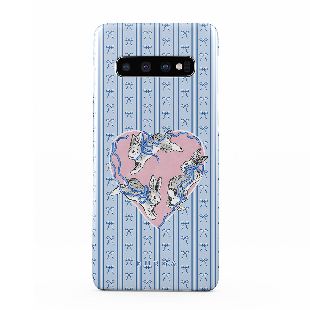 Dizaino ypatybės: balti triušiai, širdelės rėmelis, mėlynos juostelės