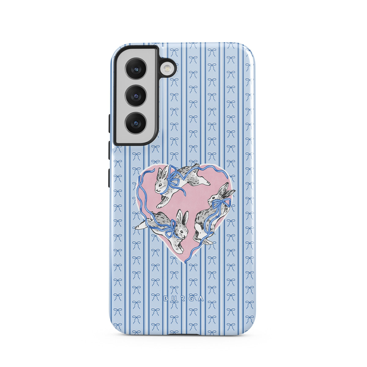 Dizaino ypatybės: balti triušiai, širdelės rėmelis, mėlynos juostelės