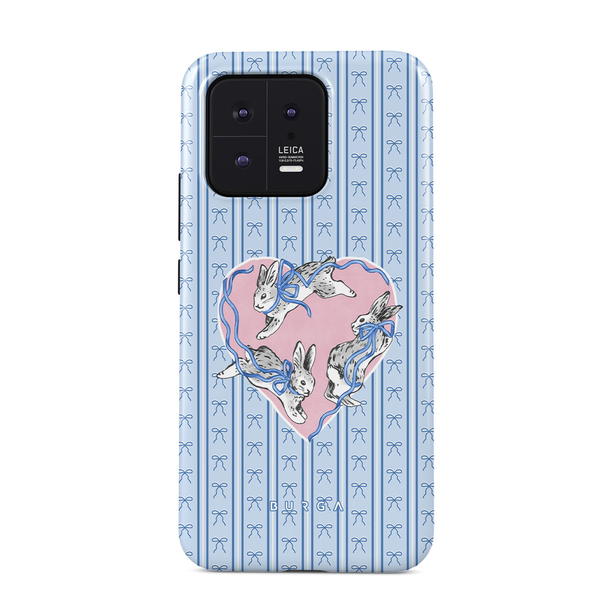 Dizaino ypatybės: balti triušiai, širdelės rėmelis, mėlynos juostelės