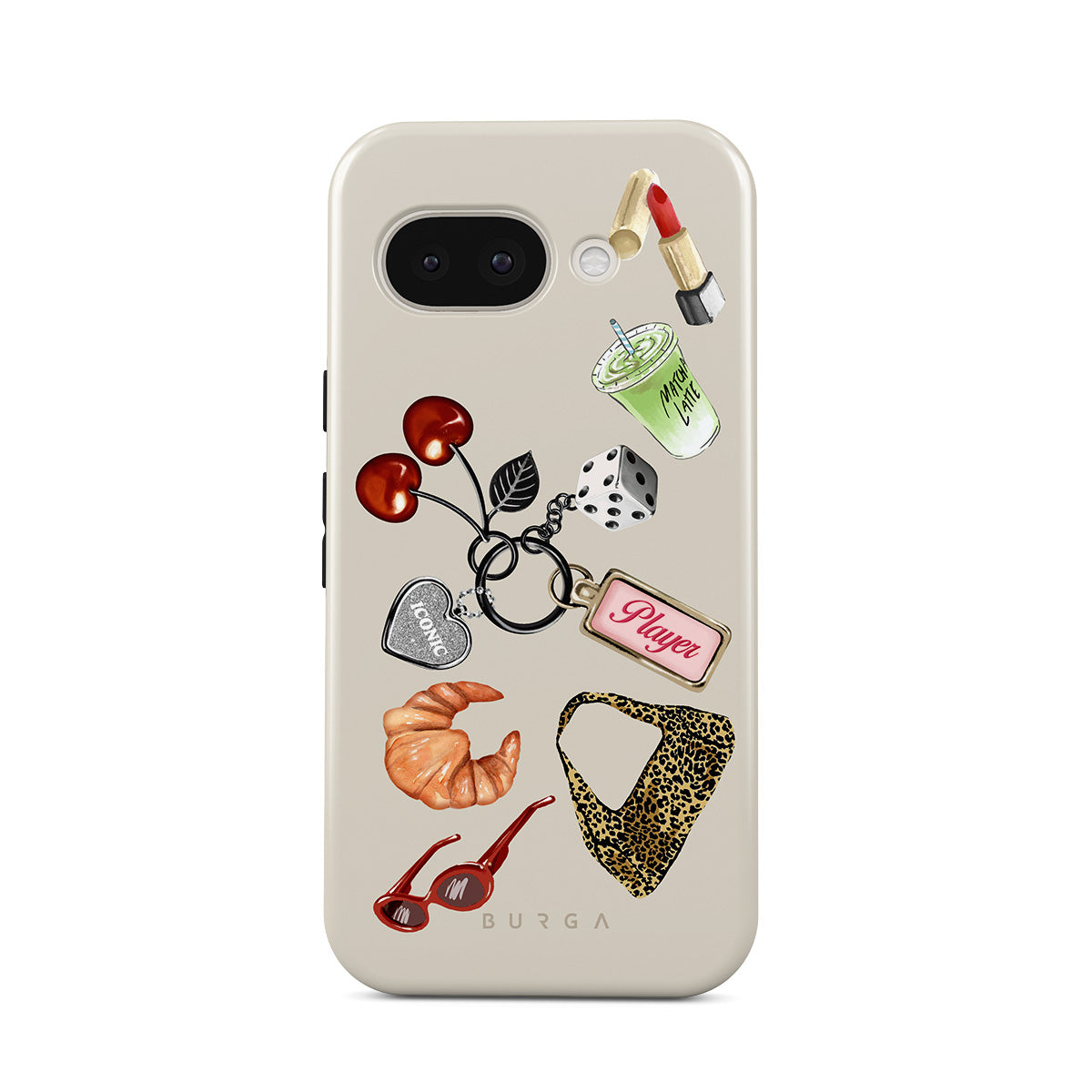 Dizaino ypatybės: raudoni akiniai nuo saulės, raudoni lūpų dažai, žalioji mačia, kruasanas, juodi kauliukai, leopardo rašto maišelis, raktų pakabukas su sidabrine širdele, vyšnios, kauliukai ir užrašas „Player“