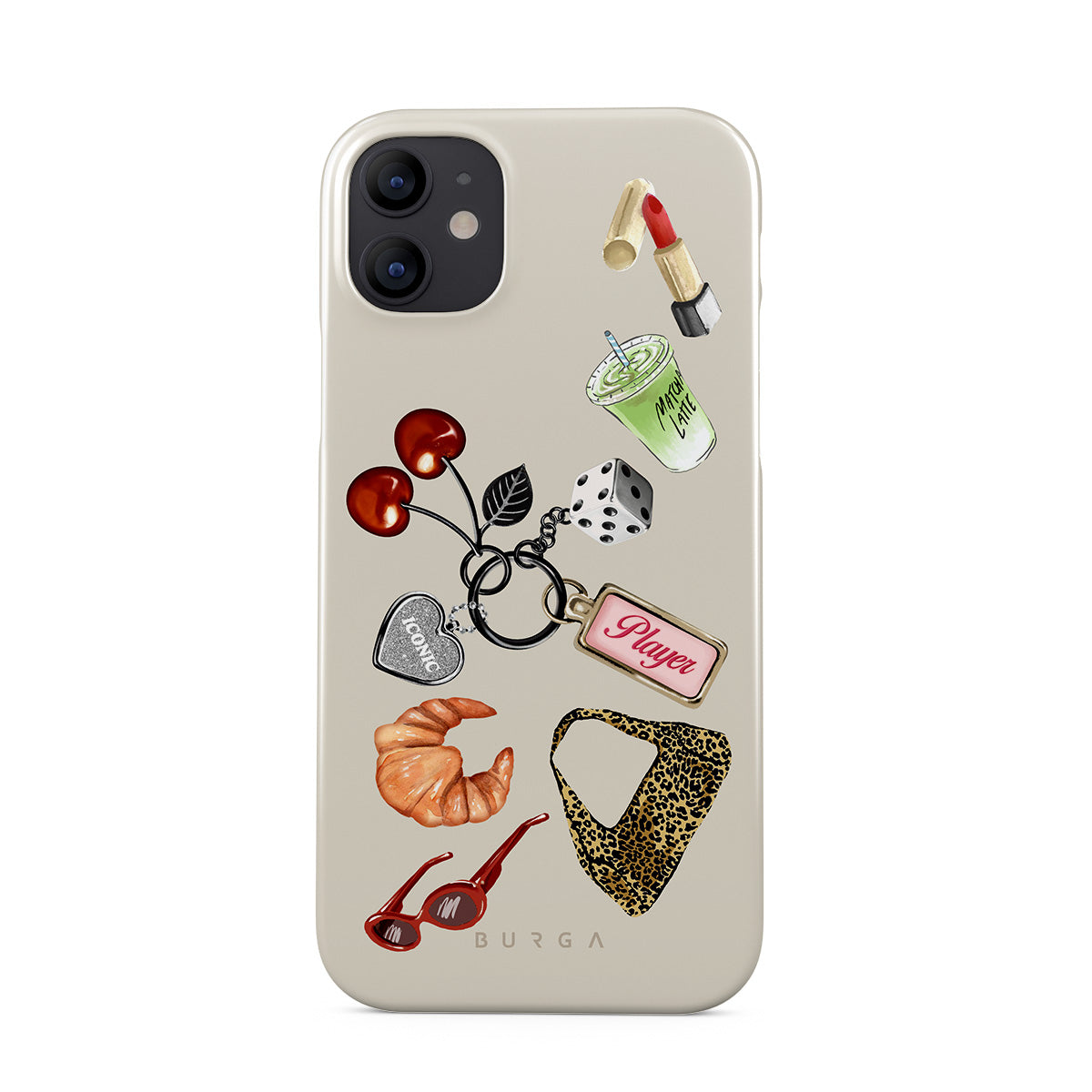 Dizaino ypatybės: raudoni akiniai nuo saulės, raudoni lūpų dažai, žalioji mačia, kruasanas, juodi kauliukai, leopardo rašto maišelis, raktų pakabukas su sidabrine širdele, vyšnios, kauliukai ir užrašas „Player“