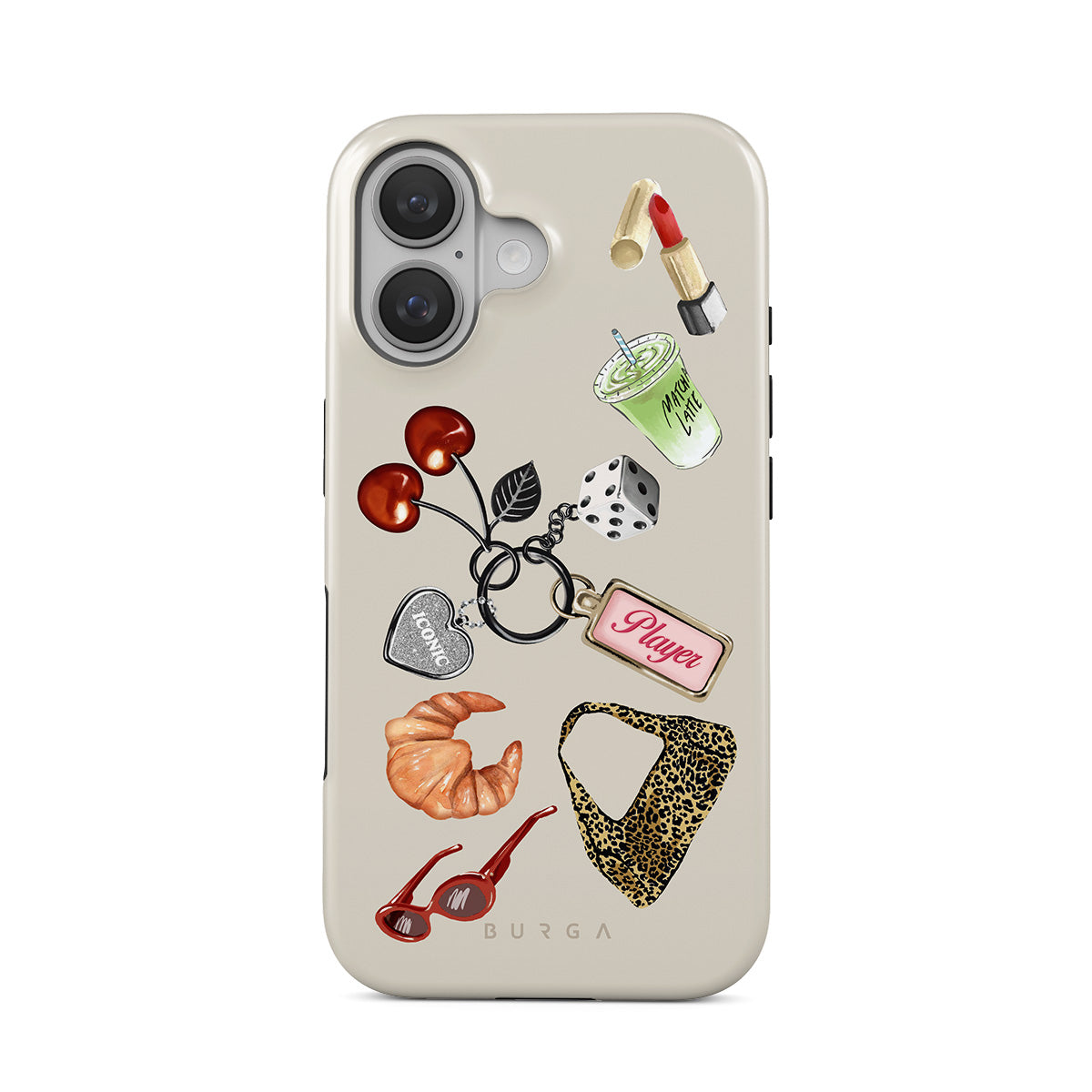 Dizaino ypatybės: raudoni akiniai nuo saulės, raudoni lūpų dažai, žalioji mačia, kruasanas, juodi kauliukai, leopardo rašto maišelis, raktų pakabukas su sidabrine širdele, vyšnios, kauliukai ir užrašas „Player“