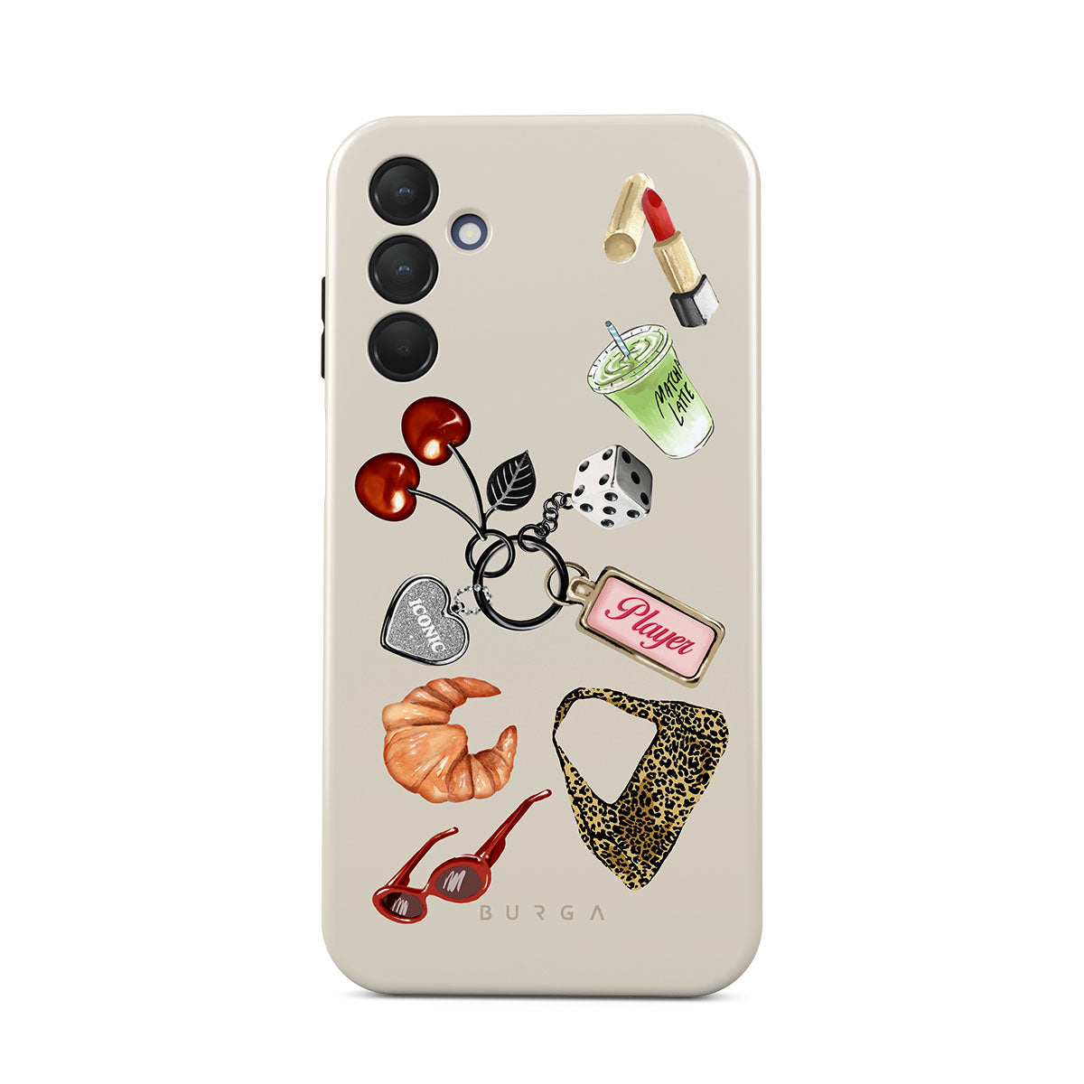 Dizaino ypatybės: raudoni akiniai nuo saulės, raudoni lūpų dažai, žalioji mačia, kruasanas, juodi kauliukai, leopardo rašto maišelis, raktų pakabukas su sidabrine širdele, vyšnios, kauliukai ir užrašas „Player“