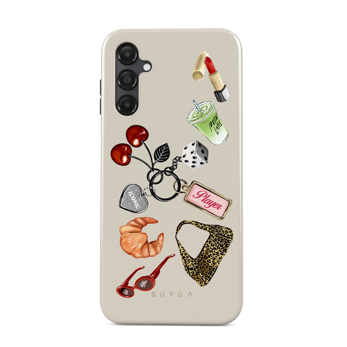 Dizaino ypatybės: raudoni akiniai nuo saulės, raudoni lūpų dažai, žalioji mačia, kruasanas, juodi kauliukai, leopardo rašto maišelis, raktų pakabukas su sidabrine širdele, vyšnios, kauliukai ir užrašas „Player“