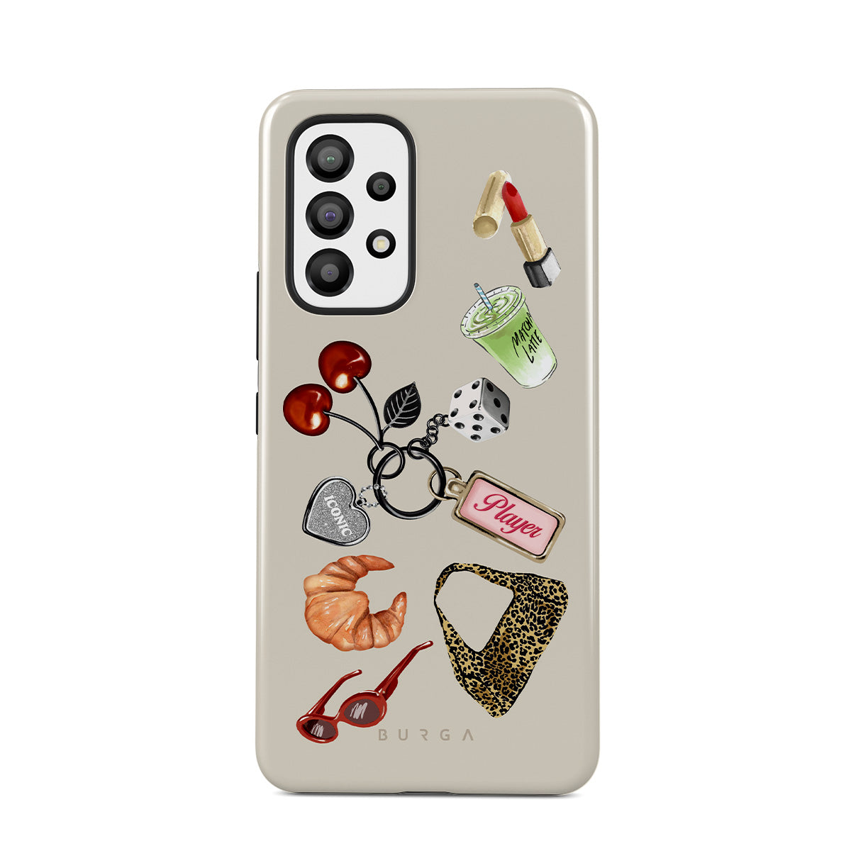 Dizaino ypatybės: raudoni akiniai nuo saulės, raudoni lūpų dažai, žalioji mačia, kruasanas, juodi kauliukai, leopardo rašto maišelis, raktų pakabukas su sidabrine širdele, vyšnios, kauliukai ir užrašas „Player“