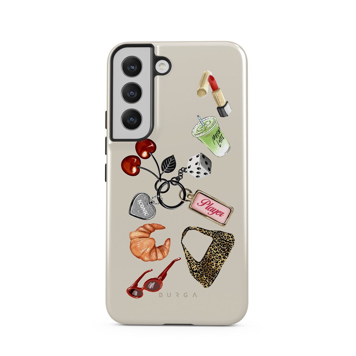 Dizaino ypatybės: raudoni akiniai nuo saulės, raudoni lūpų dažai, žalioji mačia, kruasanas, juodi kauliukai, leopardo rašto maišelis, raktų pakabukas su sidabrine širdele, vyšnios, kauliukai ir užrašas „Player“