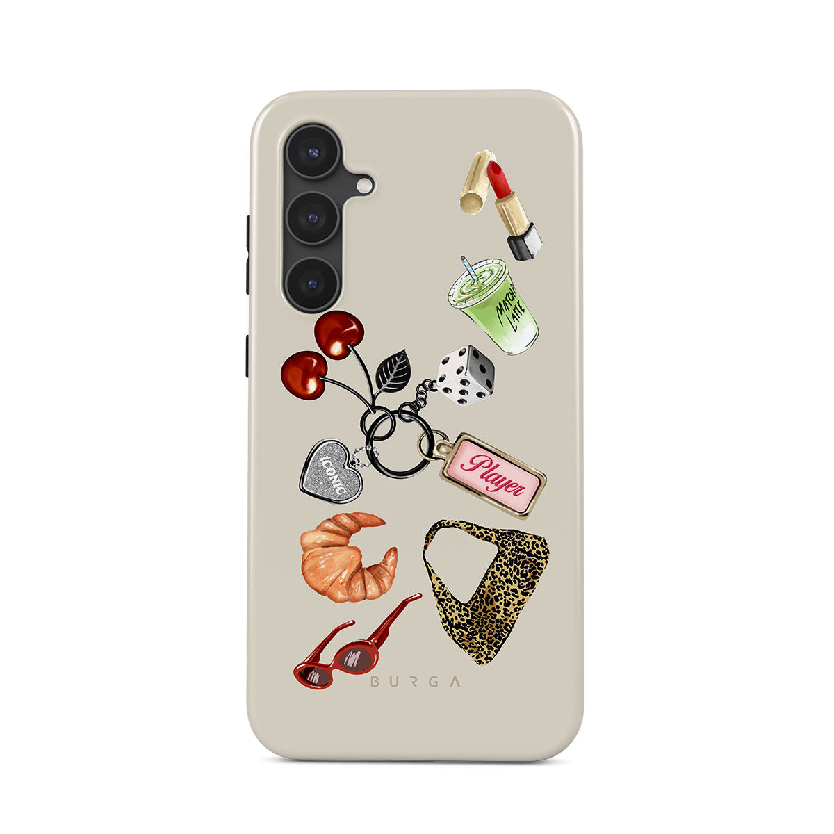 Dizaino ypatybės: raudoni akiniai nuo saulės, raudoni lūpų dažai, žalioji mačia, kruasanas, juodi kauliukai, leopardo rašto maišelis, raktų pakabukas su sidabrine širdele, vyšnios, kauliukai ir užrašas „Player“