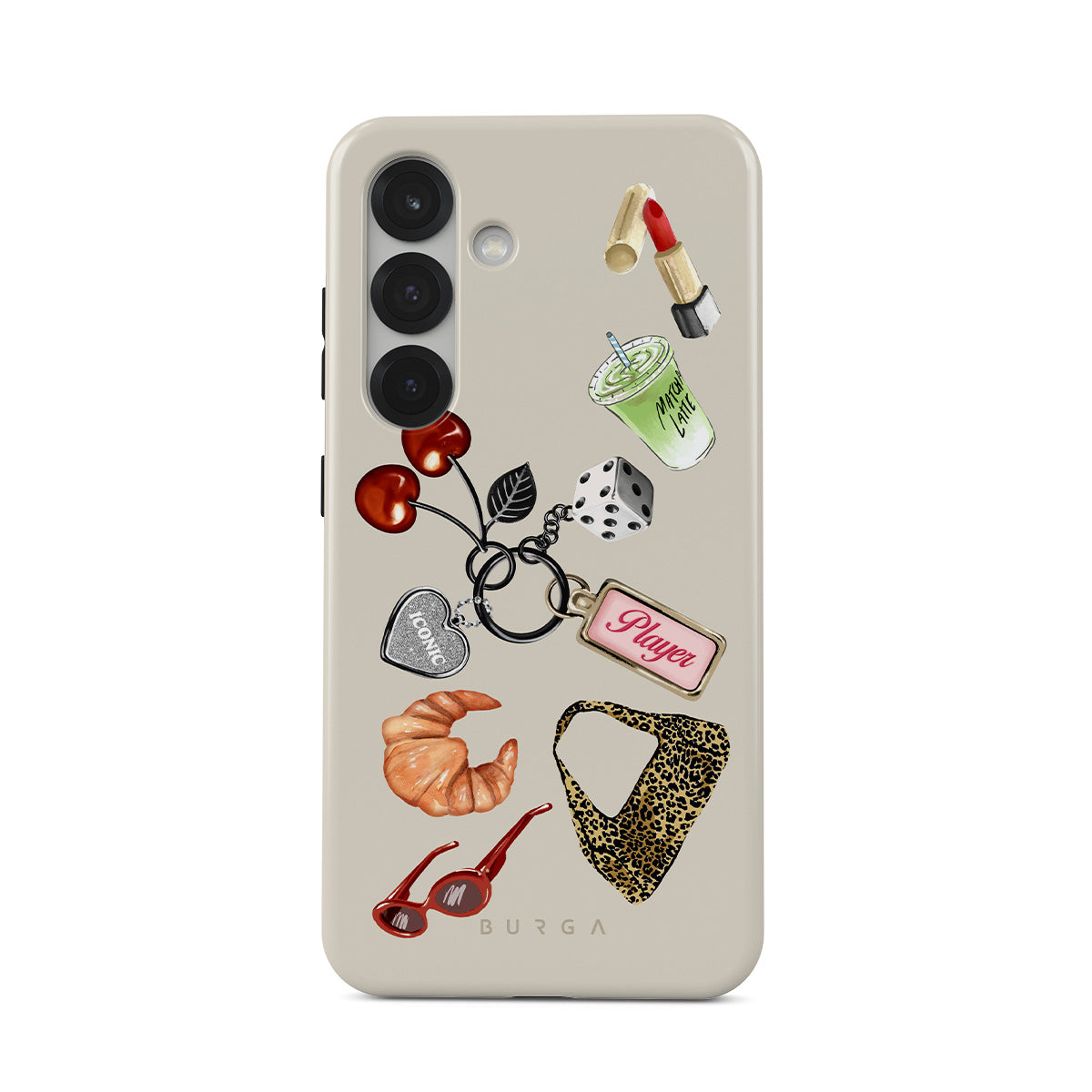 Dizaino ypatybės: raudoni akiniai nuo saulės, raudoni lūpų dažai, žalioji mačia, kruasanas, juodi kauliukai, leopardo rašto maišelis, raktų pakabukas su sidabrine širdele, vyšnios, kauliukai ir užrašas „Player“