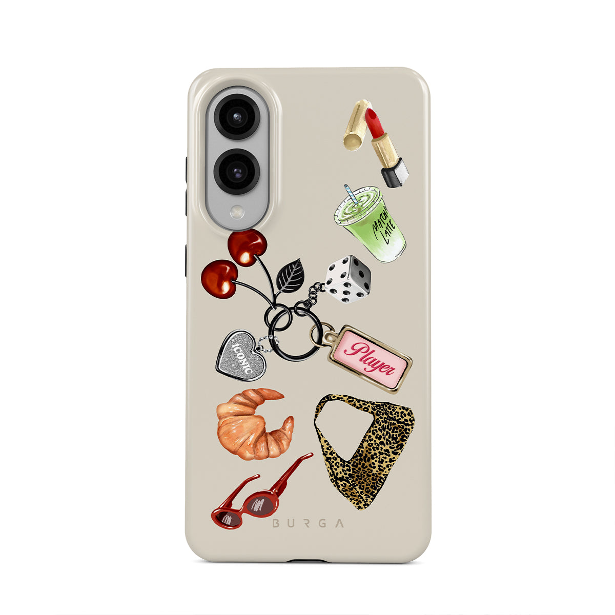 Dizaino ypatybės: raudoni akiniai nuo saulės, raudoni lūpų dažai, žalioji mačia, kruasanas, juodi kauliukai, leopardo rašto maišelis, raktų pakabukas su sidabrine širdele, vyšnios, kauliukai ir užrašas „Player“