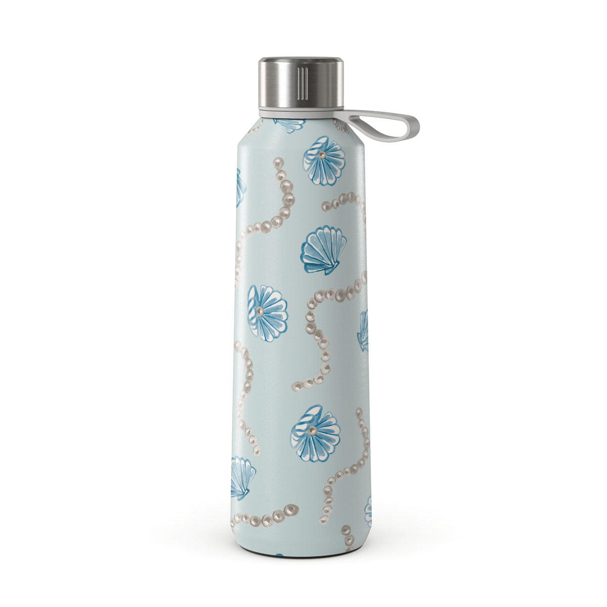 Dizaino ypatybės: perlai, geldelės, šviesiai mėlynas fonas, jūros elementai