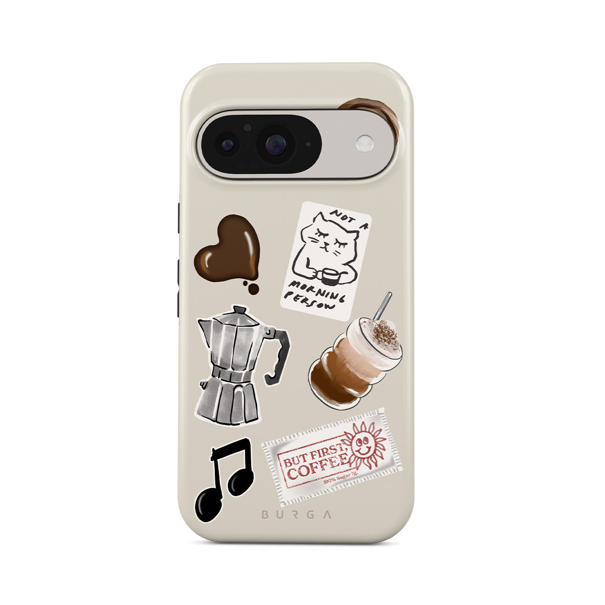 Dizaino ypatybės: mokos puodelis, frapė, cinamoninė bandelė, šokoladinė širdelė, lipdukas „Not a morning person“, kvitas „But First, Coffee“, nata
