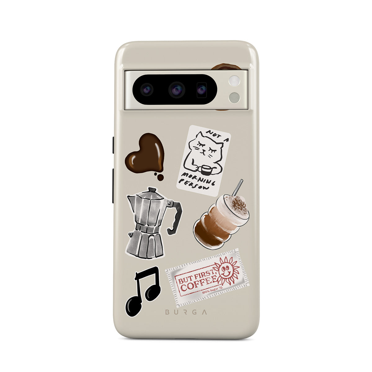 Dizaino ypatybės: mokos puodelis, frapė, cinamoninė bandelė, šokoladinė širdelė, lipdukas „Not a morning person“, kvitas „But First, Coffee“, nata