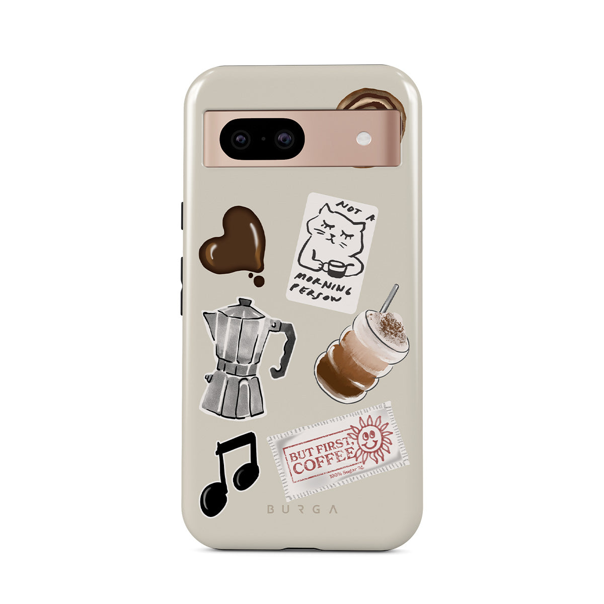 Dizaino ypatybės: mokos puodelis, frapė, cinamoninė bandelė, šokoladinė širdelė, lipdukas „Not a morning person“, kvitas „But First, Coffee“, nata