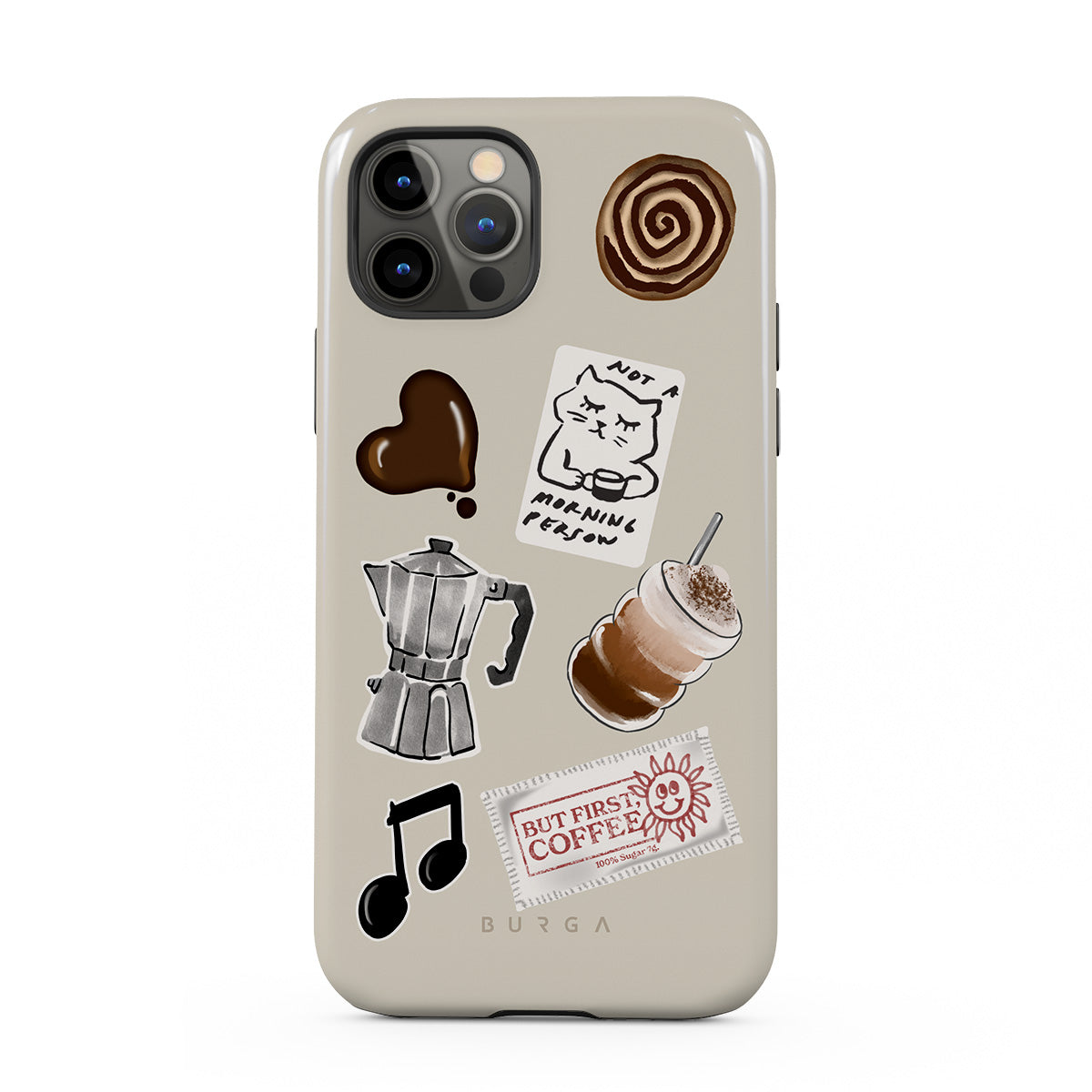 Dizaino ypatybės: mokos puodelis, frapė, cinamoninė bandelė, šokoladinė širdelė, lipdukas „Not a morning person“, kvitas „But First, Coffee“, nata