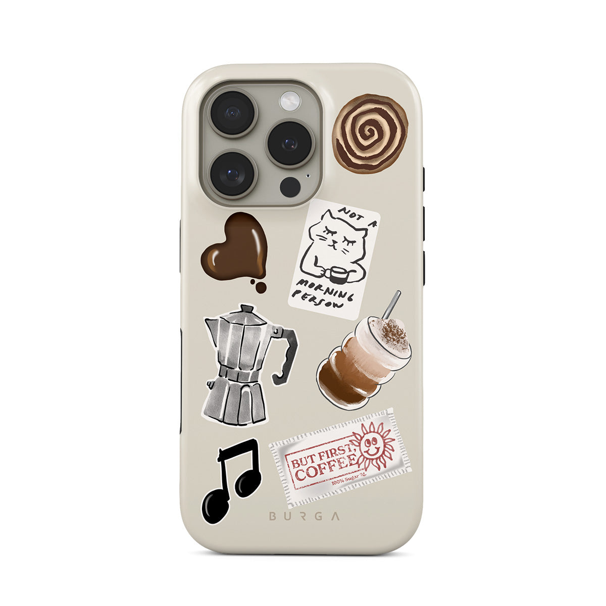 Dizaino ypatybės: mokos puodelis, frapė, cinamoninė bandelė, šokoladinė širdelė, lipdukas „Not a morning person“, kvitas „But First, Coffee“, nata