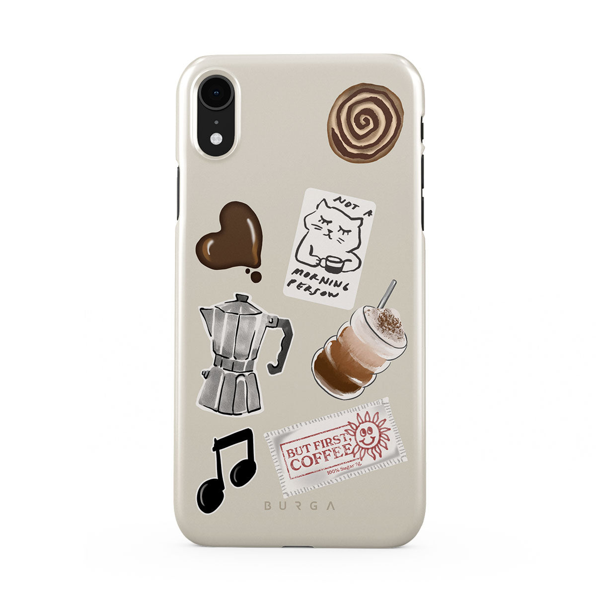 Dizaino ypatybės: mokos puodelis, frapė, cinamoninė bandelė, šokoladinė širdelė, lipdukas „Not a morning person“, kvitas „But First, Coffee“, nata