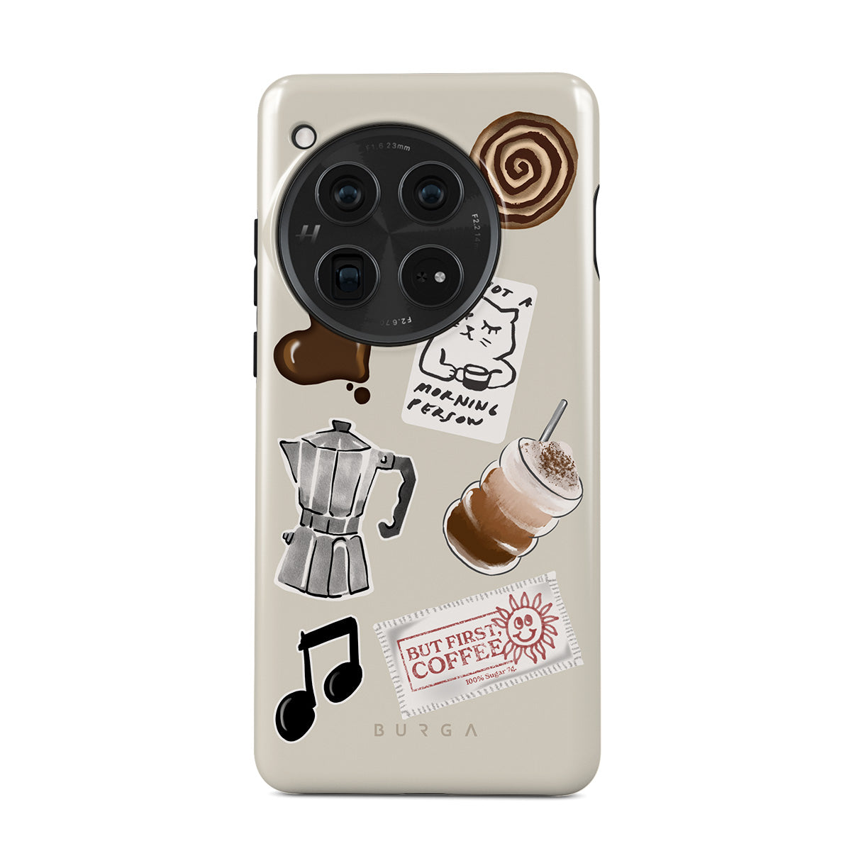 Dizaino ypatybės: mokos puodelis, frapė, cinamoninė bandelė, šokoladinė širdelė, lipdukas „Not a morning person“, kvitas „But First, Coffee“, nata