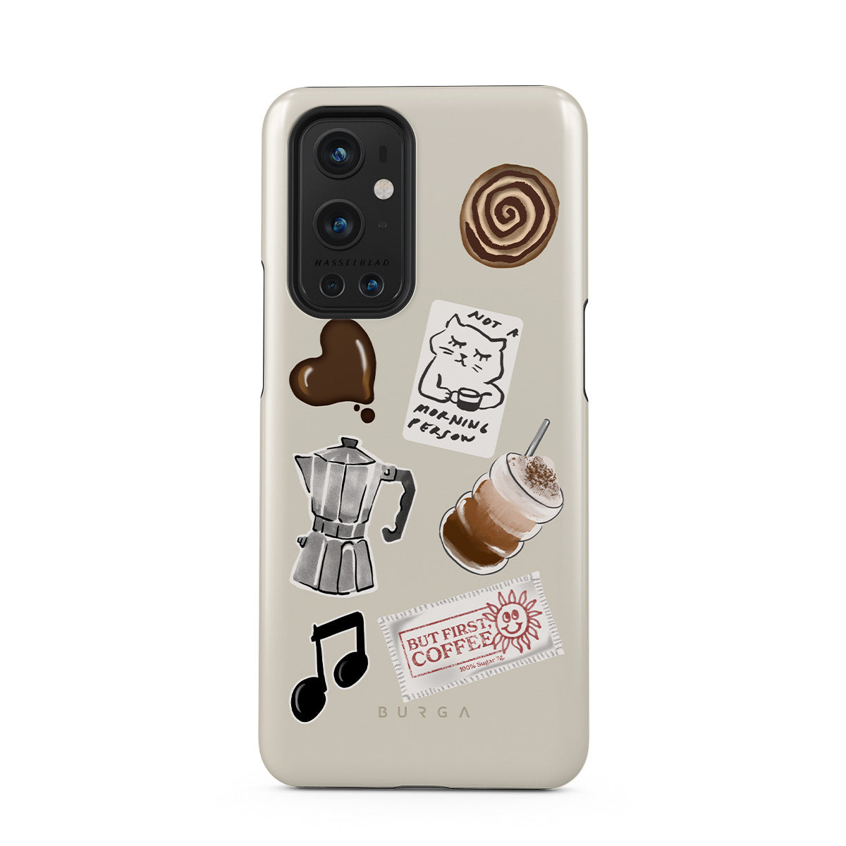 Dizaino ypatybės: mokos puodelis, frapė, cinamoninė bandelė, šokoladinė širdelė, lipdukas „Not a morning person“, kvitas „But First, Coffee“, nata