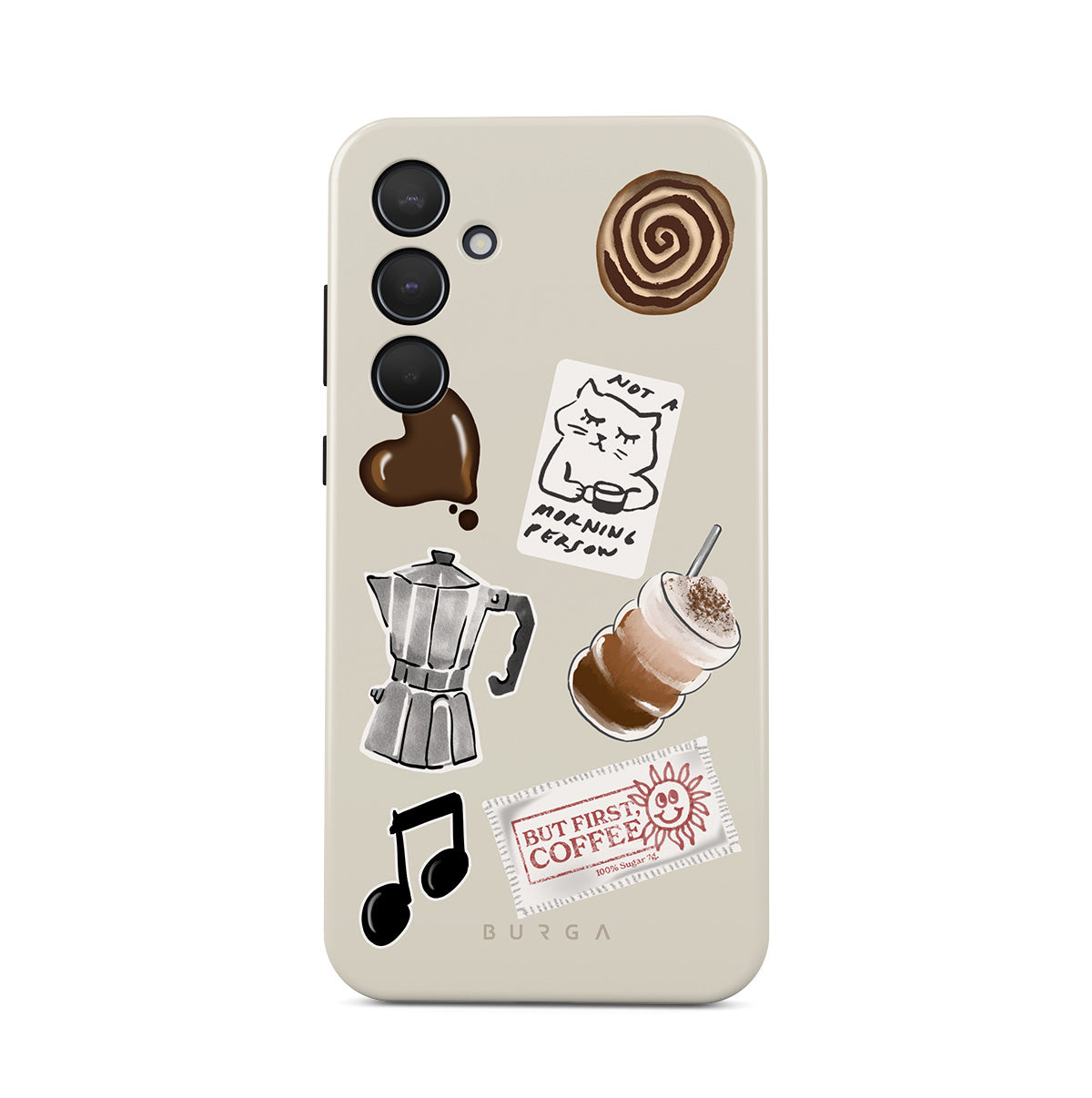 Dizaino ypatybės: mokos puodelis, frapė, cinamoninė bandelė, šokoladinė širdelė, lipdukas „Not a morning person“, kvitas „But First, Coffee“, nata