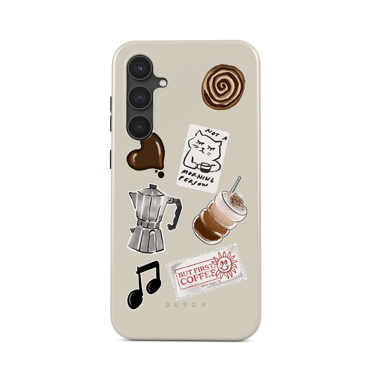 Dizaino ypatybės: mokos puodelis, frapė, cinamoninė bandelė, šokoladinė širdelė, lipdukas „Not a morning person“, kvitas „But First, Coffee“, nata