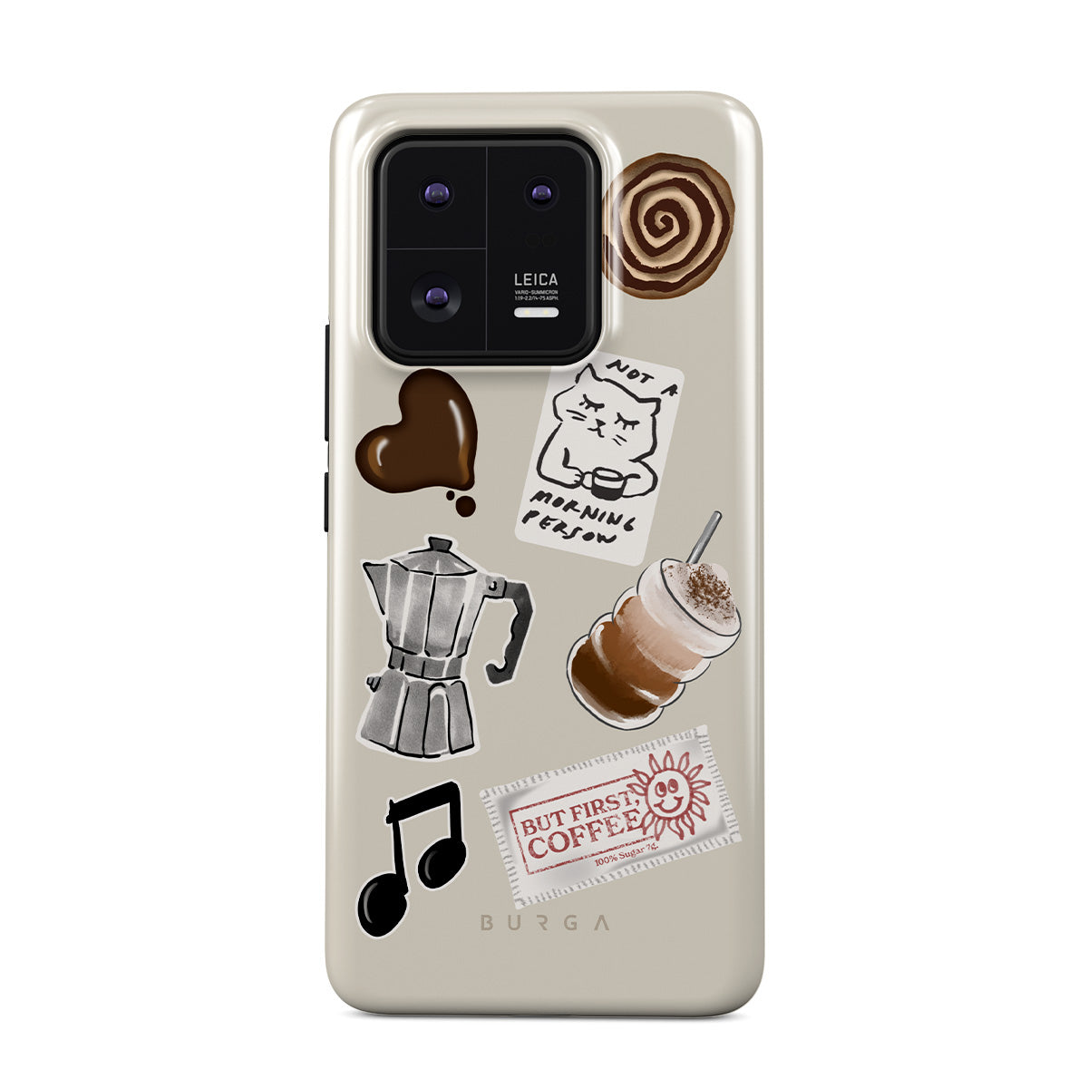 Dizaino ypatybės: mokos puodelis, frapė, cinamoninė bandelė, šokoladinė širdelė, lipdukas „Not a morning person“, kvitas „But First, Coffee“, nata