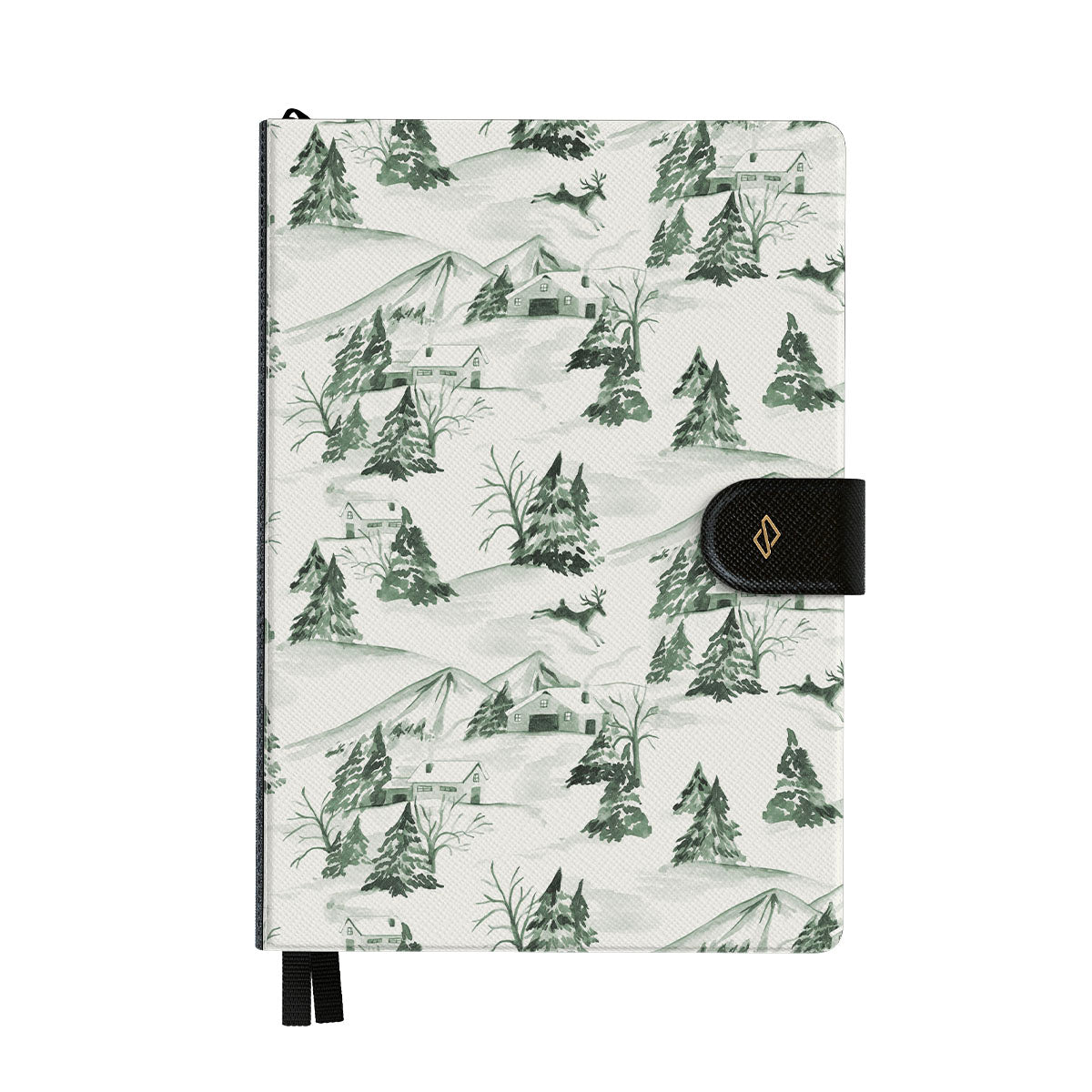 Dizaino ypatybės: žiemos miško scena, pušys, sniego peizažas, žalia ir balta, gamtos raštas, miško Kalėdos, visžaliai medžiai, vintage iliustracijos stilius