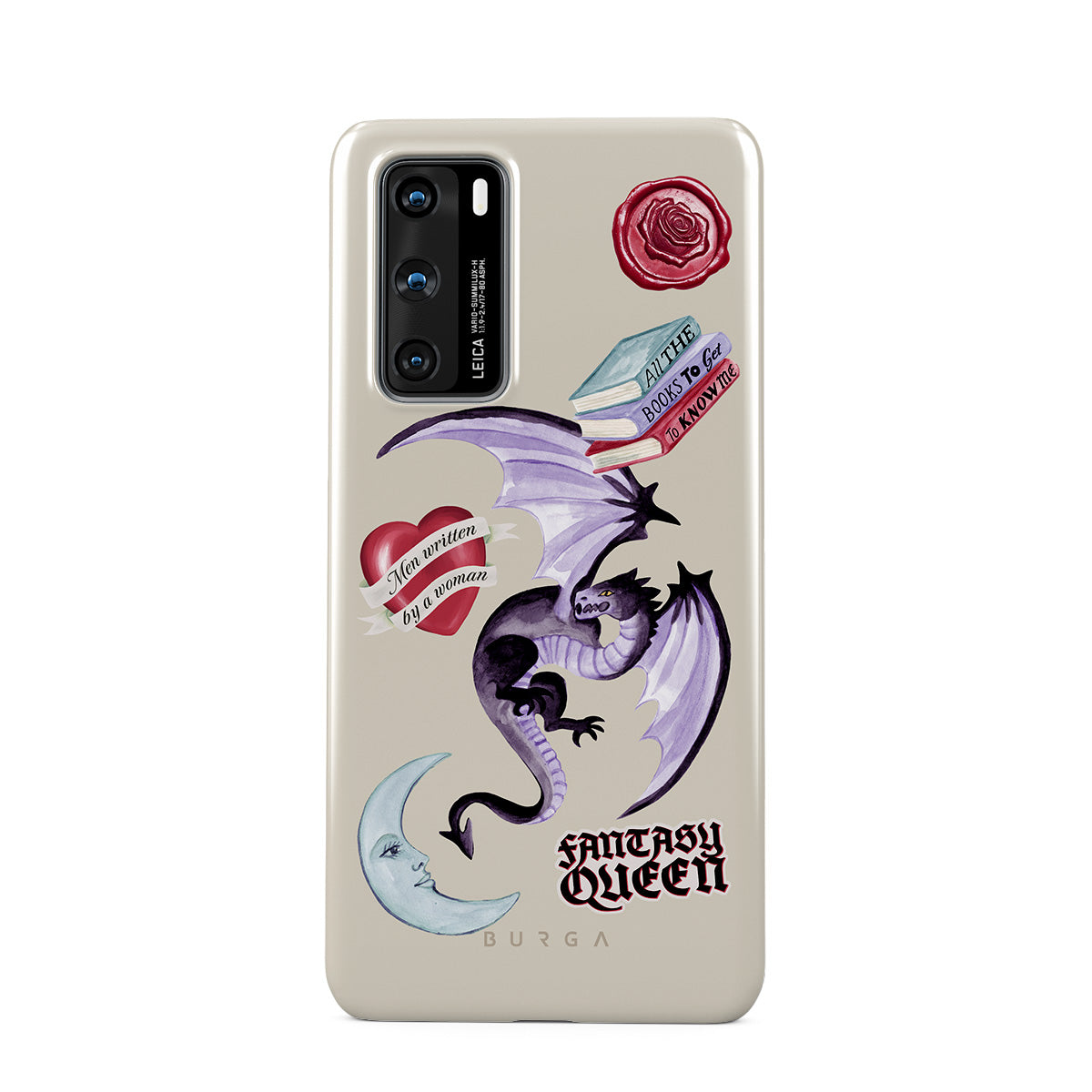 Dizaino ypatybės: violetinis drakonas, lipdukas „Fantasy Queen“, pusmėnulis, violetinis vaško antspaudas, širdis su žinute, knygos