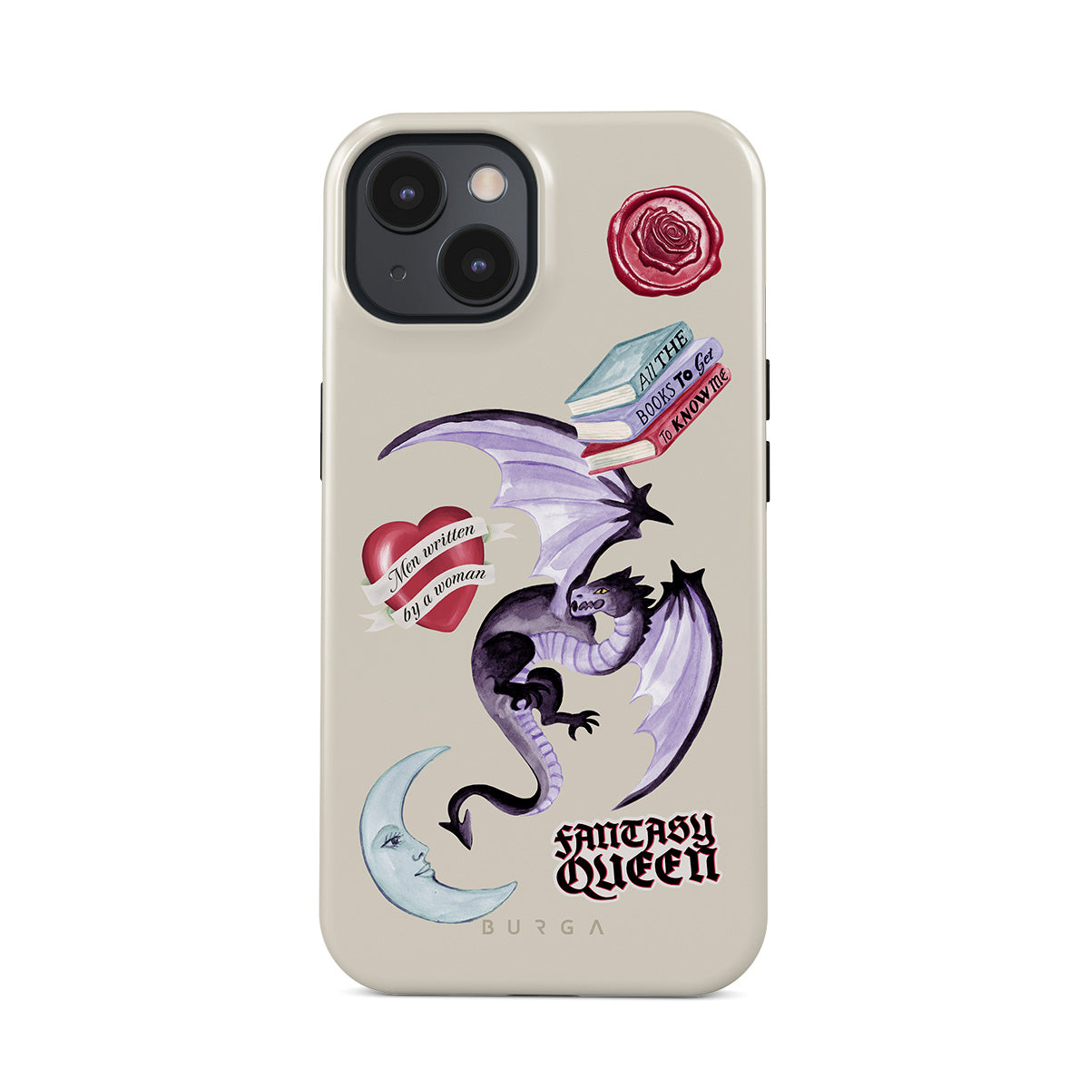 Dizaino ypatybės: violetinis drakonas, lipdukas „Fantasy Queen“, pusmėnulis, violetinis vaško antspaudas, širdis su žinute, knygos